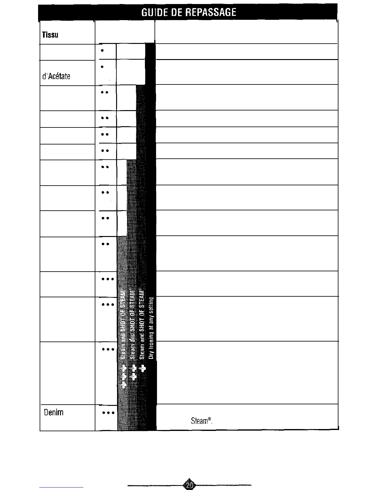 Repasser essentiellement à sec. Utiliser la vapeur