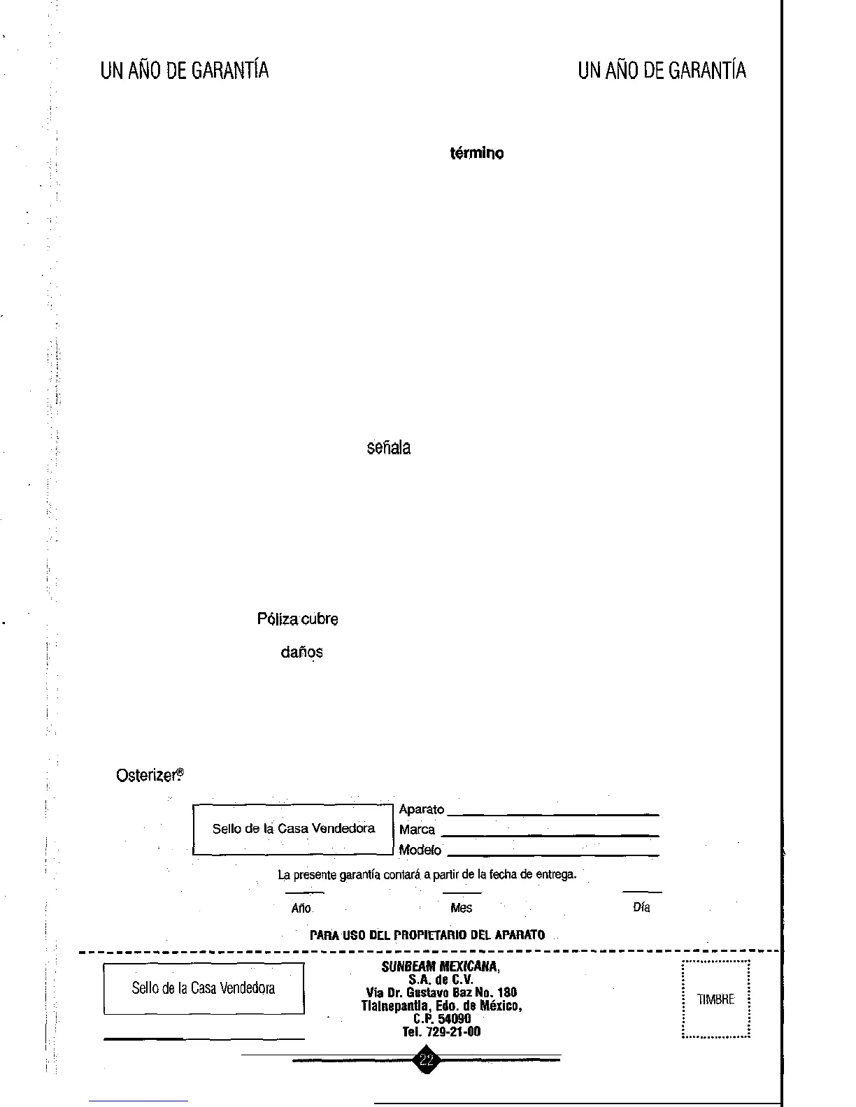 Sunbeam Mexicana S.A. de C.V. garantiza por el t6rmino de,un año este