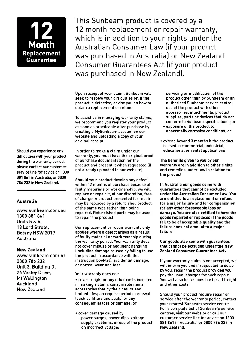 Sunbeam TA2320 - 12 Month Replacement Guarantee
