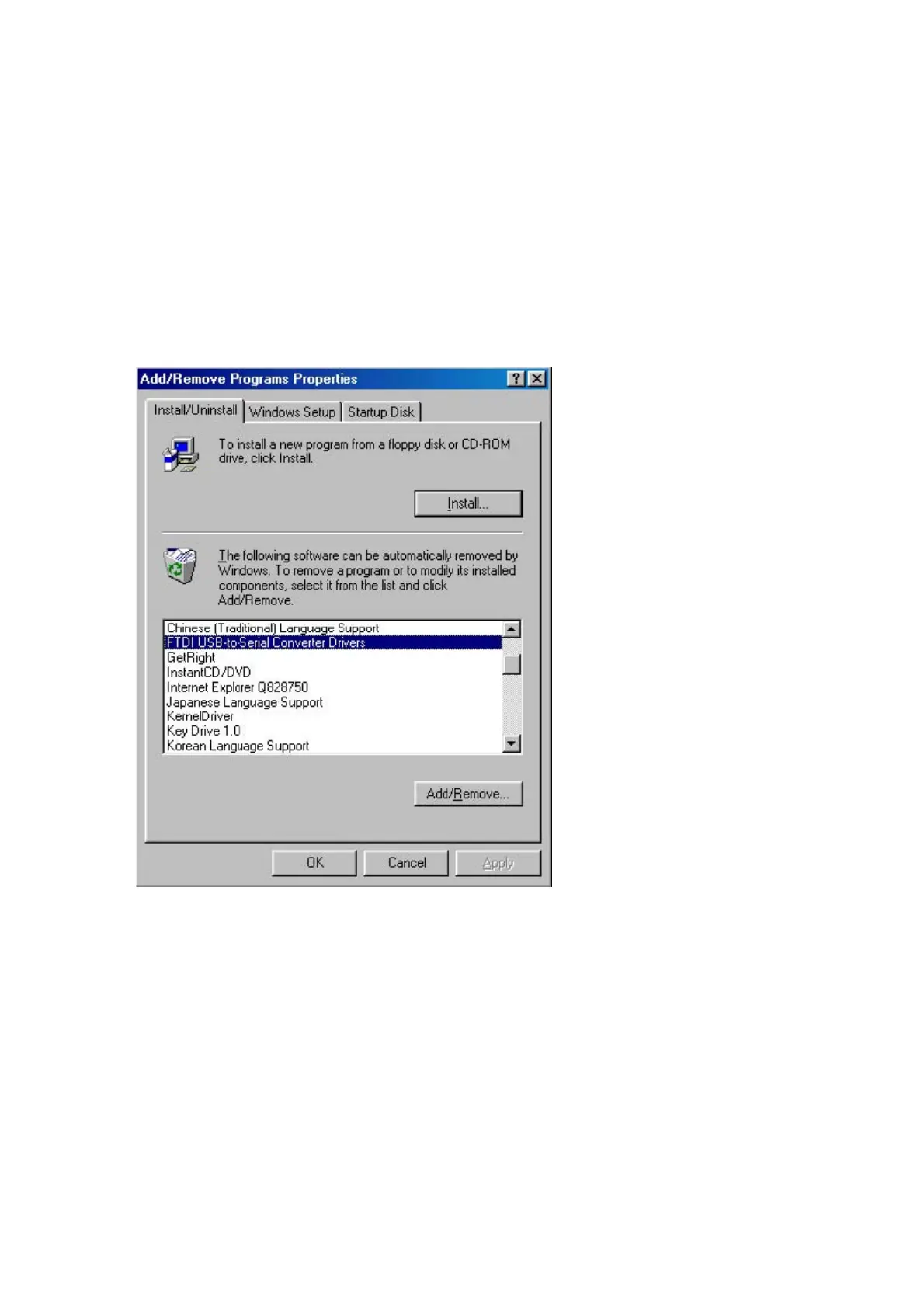 Click the "Add/Remove" button. This will run the FTDI uninstaller program. Click