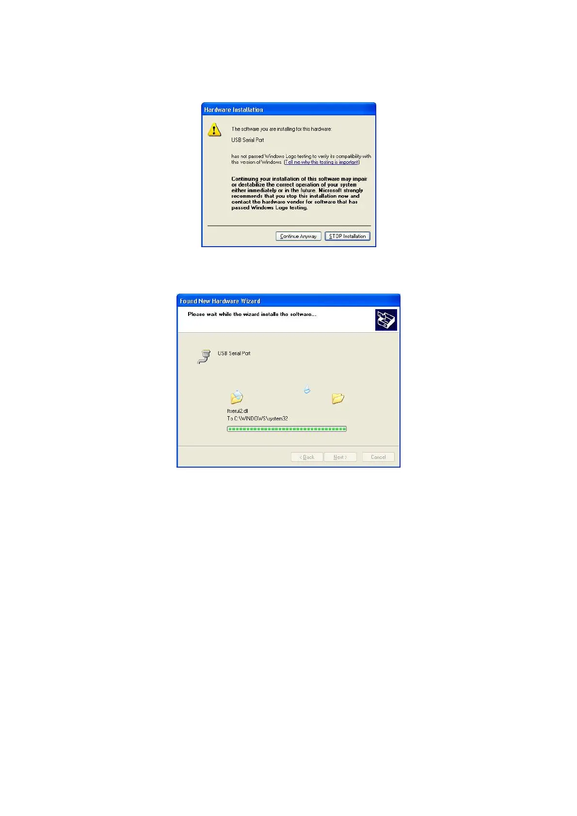 the first screen of the Found New Hardware Wizard for the USB Serial Port device. If the