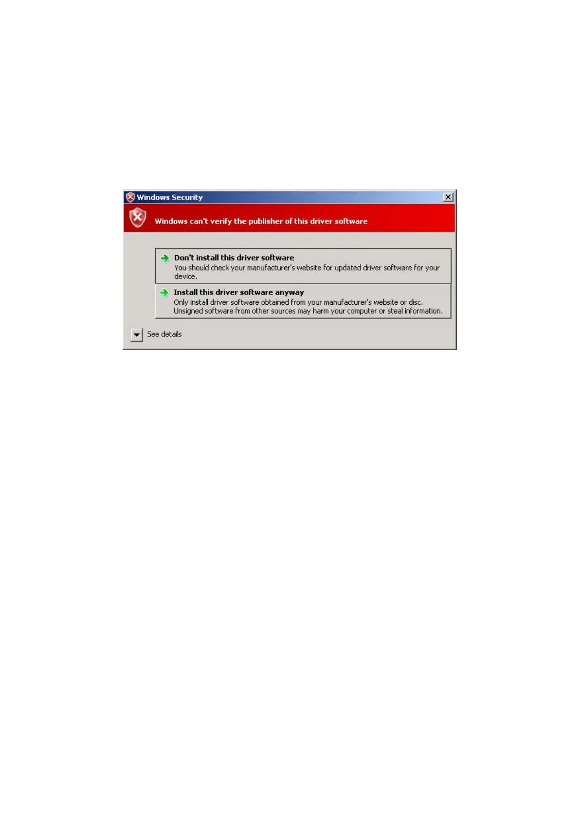 If the driver is not certified then a pop up window such as shown below will be displayed.