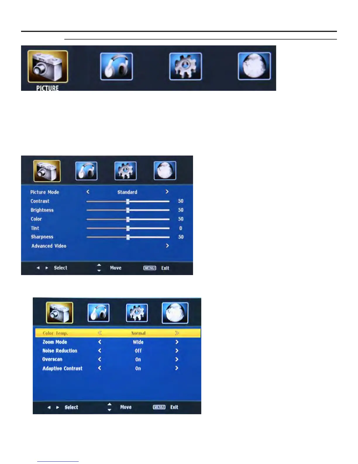 From the PICTURE menu you can adjust PICTURE MODE, CONTRAST, BRIGHTNESS, COLOR, TINT SHARPNESS, ADVANCED VIDEO.