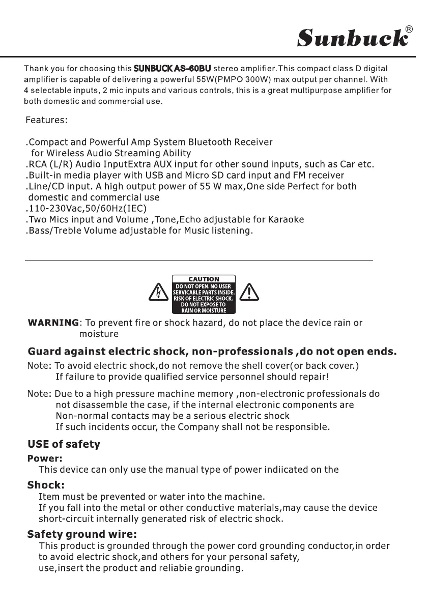 Sunbuck AS60BU - Product Features; Safety Information; General Safety Warnings; Electrical Safety Guidelines
