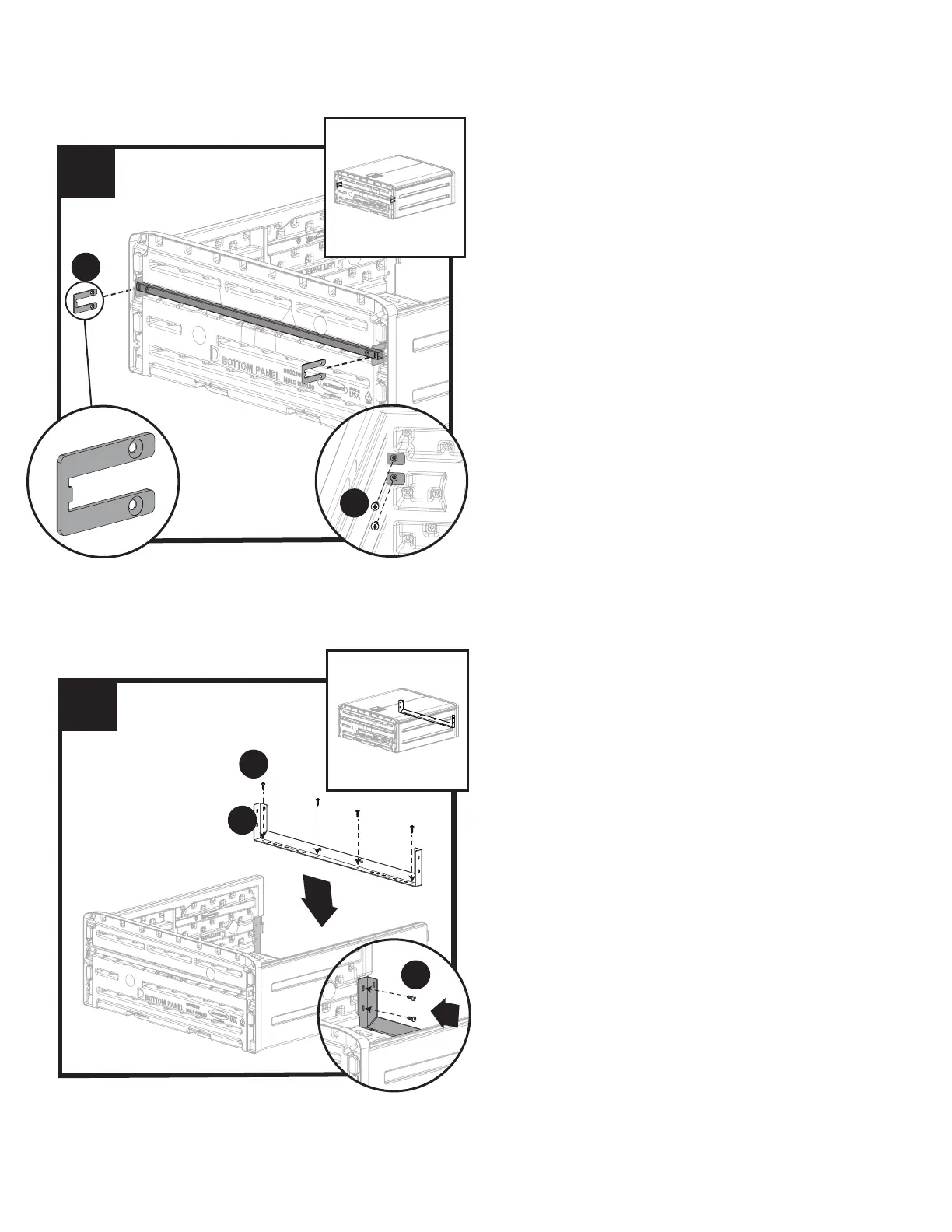 Insert bracket (J) through slot on bottom panel and attach using two