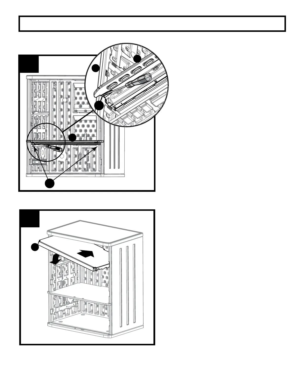 Insert shelf (F) into cabinet at an angle. Lower shelf down onto