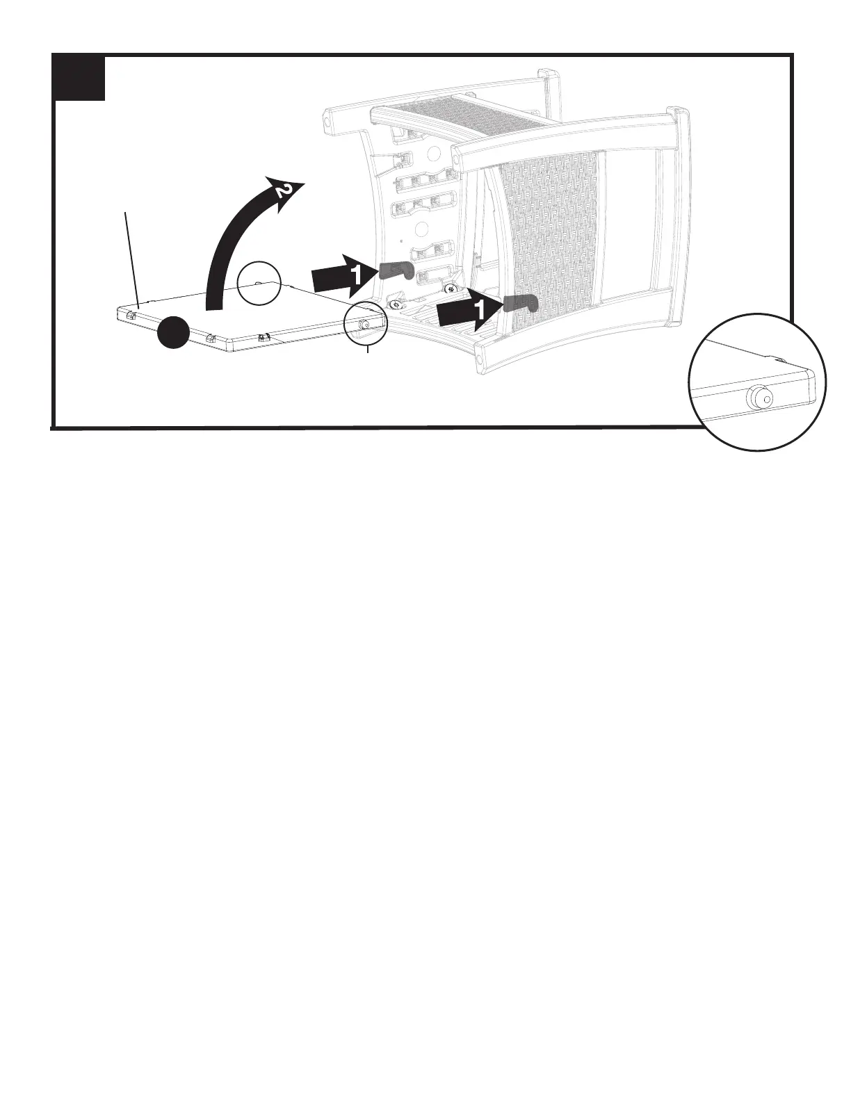 Placez le fauteuil de manière à ce qu’elle soit orientée comme indiqué ci-dessus. Glissez les chevilles rondes du panneau inféri-
