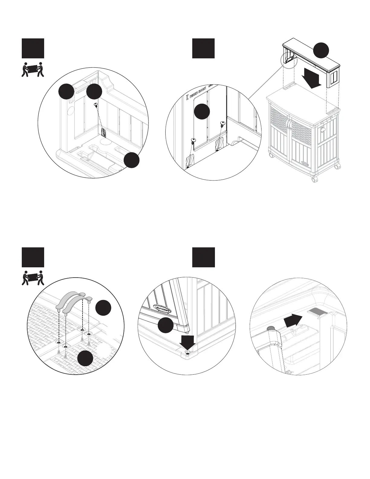 côté. Abaisser le dos de la huche (I/J) sur l’armoire et le placer dans l’encoche du dessus (F). Fixer le tout à l’aide de deux vis (P). Répéter