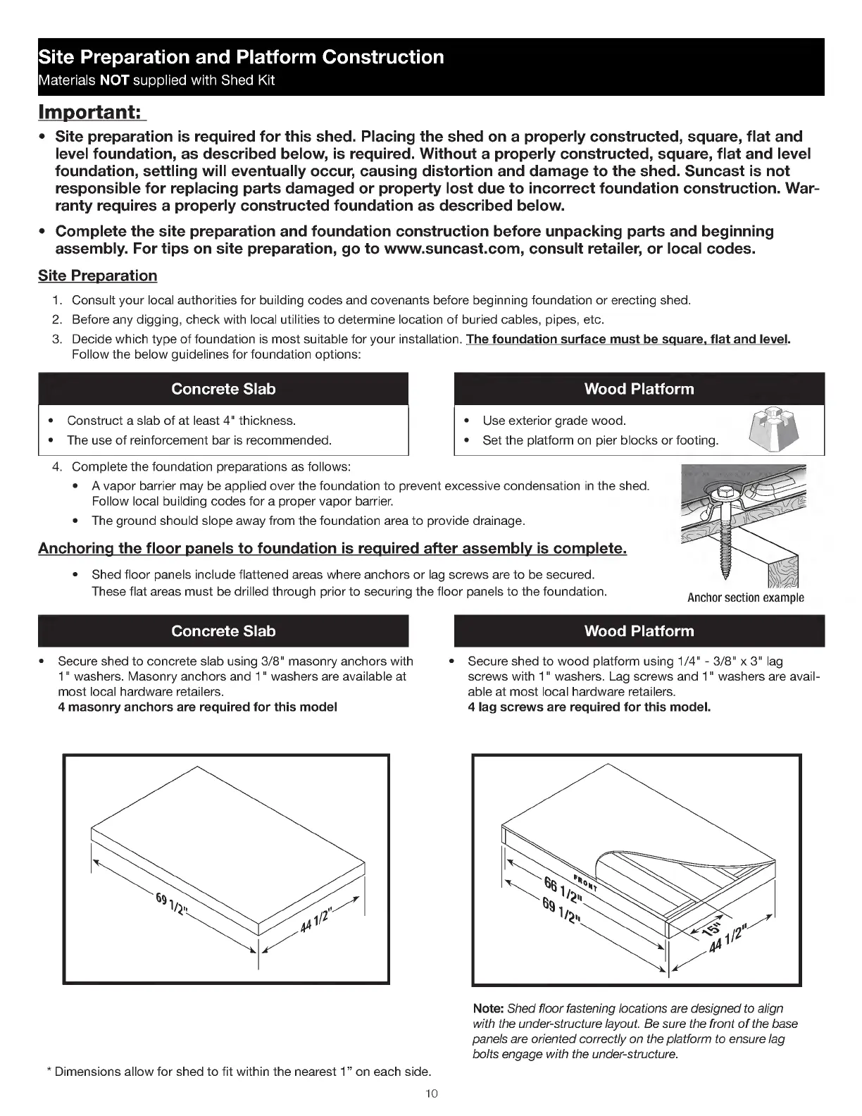 Suncast BMS6202 - Site Preparation and Platform Construction; Site Preparation; Foundation Options; Anchoring the floor panels to foundation
