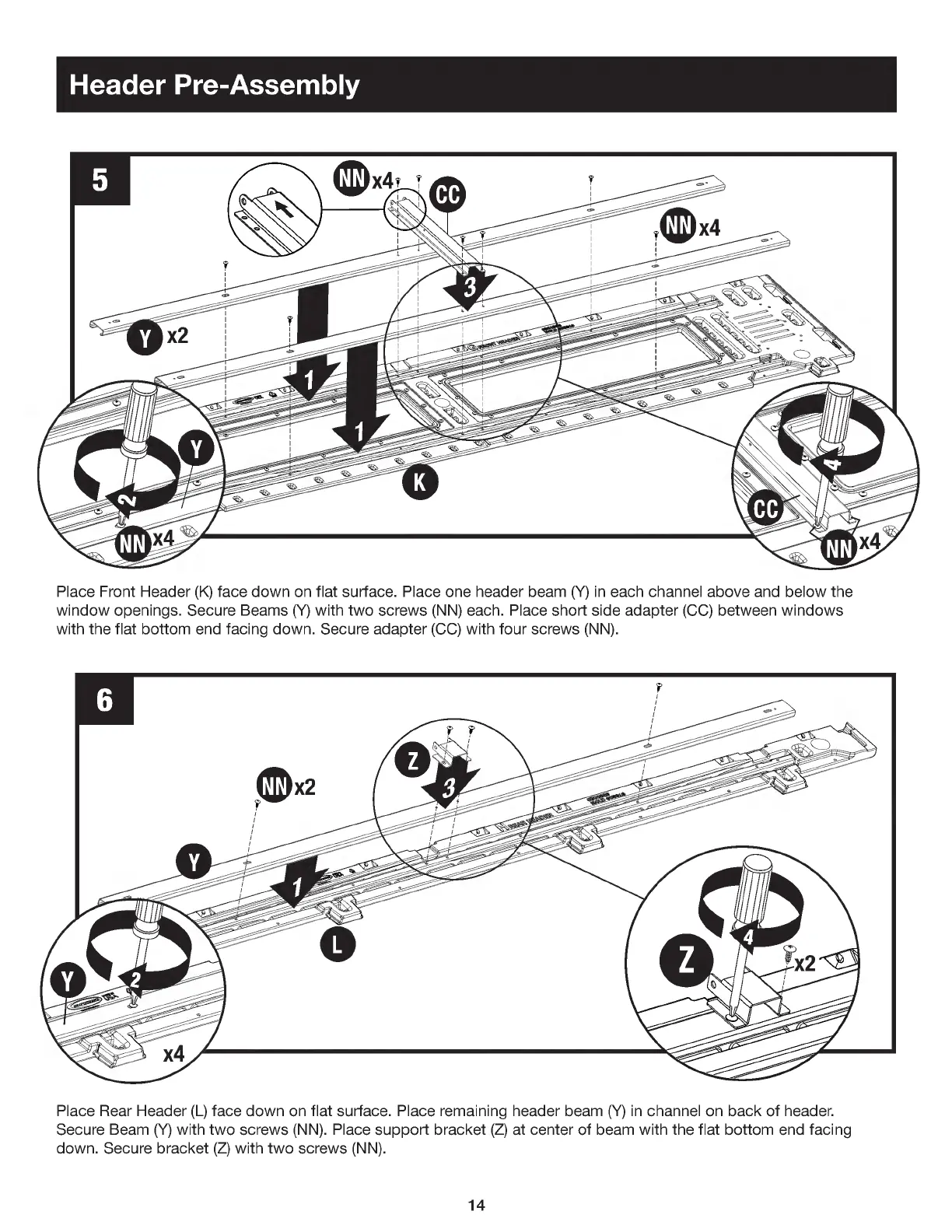 Suncast BMS6583 - Header Pre-Assembly; Install Beams and Adapters on Front Header; Install Beam and Bracket on Rear Header