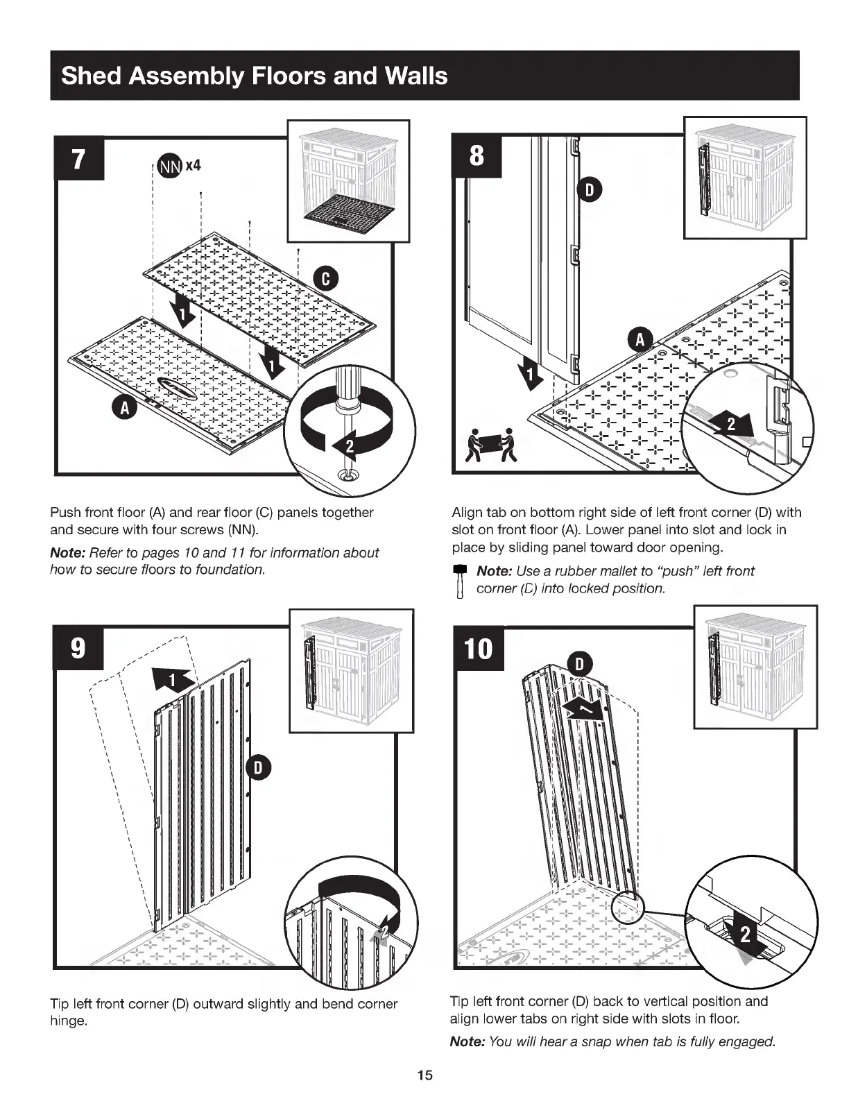 Suncast BMS6583 - Shed Assembly - Floors and Walls; Connect Floor Panels; Attach Left Front Corner Panel; Adjust Left Front Corner Panel