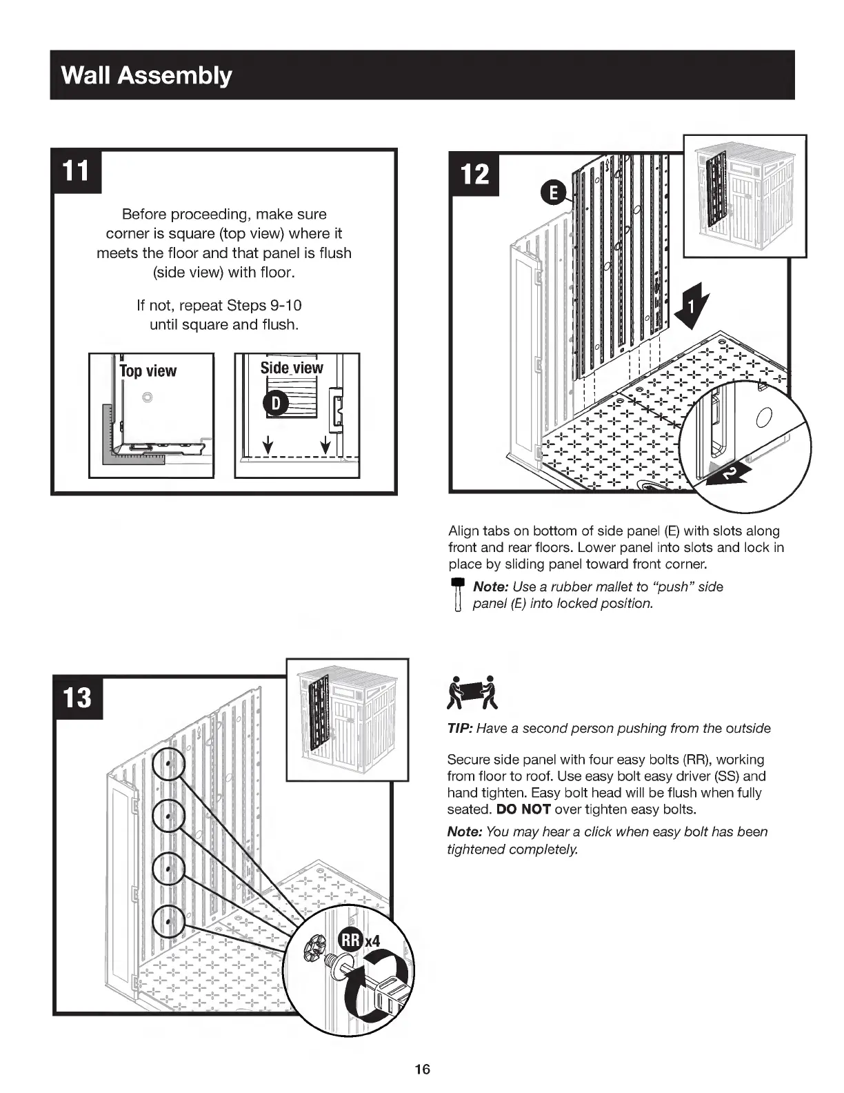 Suncast BMS6583 - Wall Assembly; Ensure Wall Squareness and Flushness; Attach Side Panel; Secure Side Panel with Easy Bolts