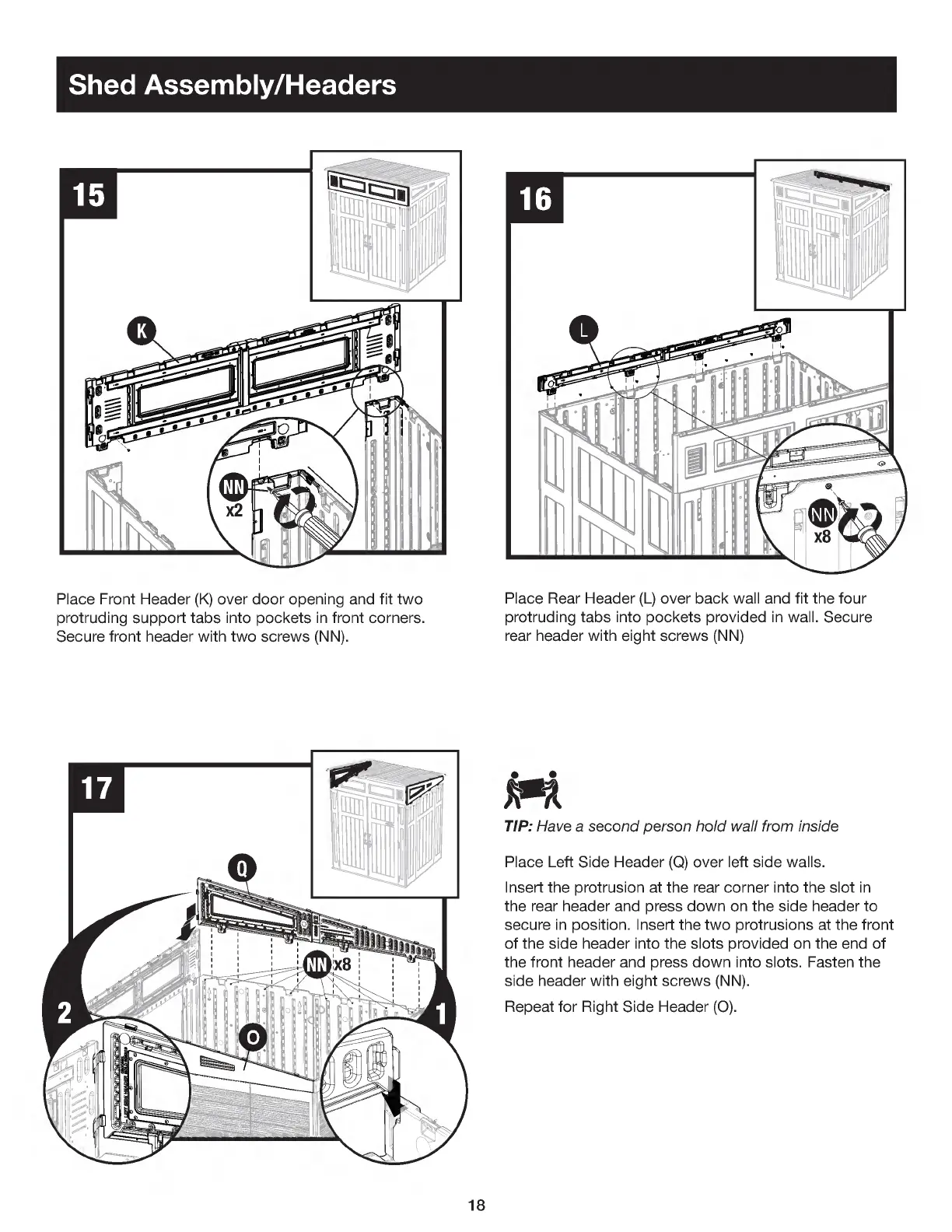 Suncast BMS6583 - Shed Assembly - Headers; Install Front Header; Install Rear Header; Install Side Headers