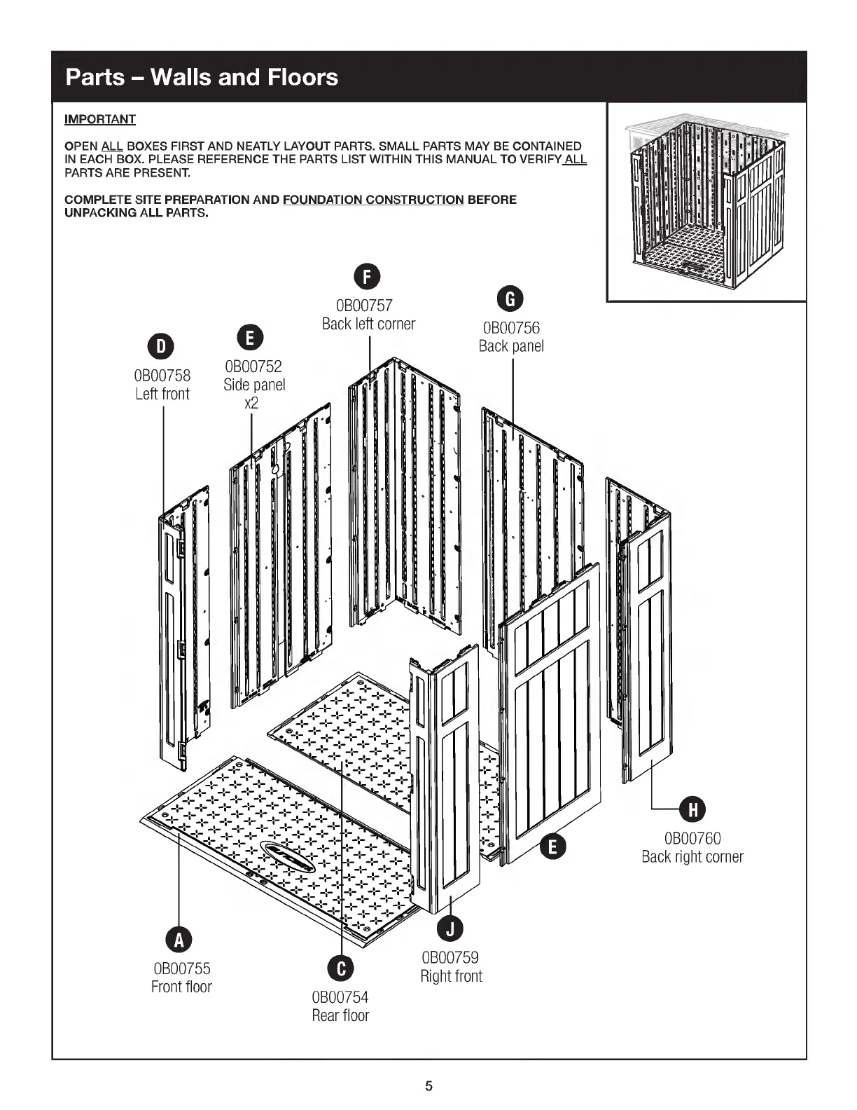 Suncast BMS6583 - Parts - Walls and Floors