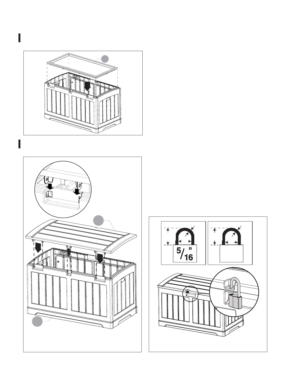 Lower top (E) onto top of box. Insert each hole on lid hing-