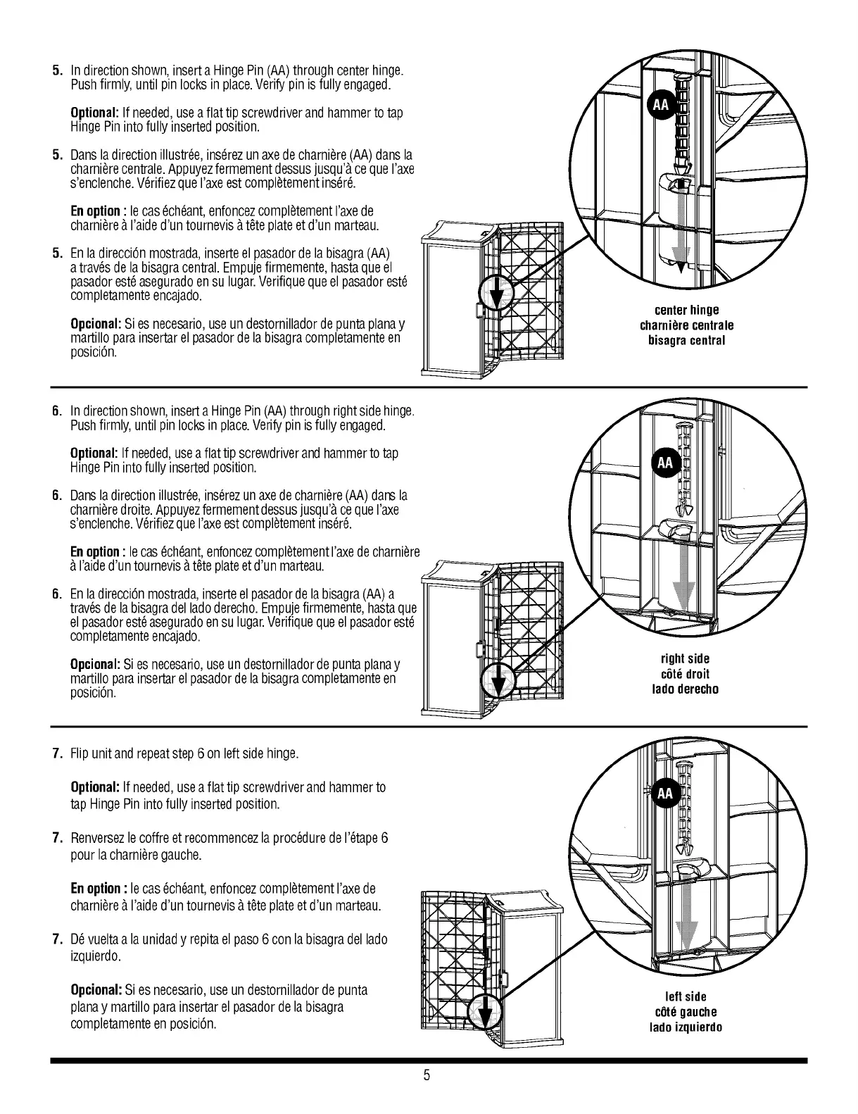 Suncast DBW7300 - Deck Box Assembly Steps 5-7; Installing Center Hinge Pin; Installing Side Hinge Pins