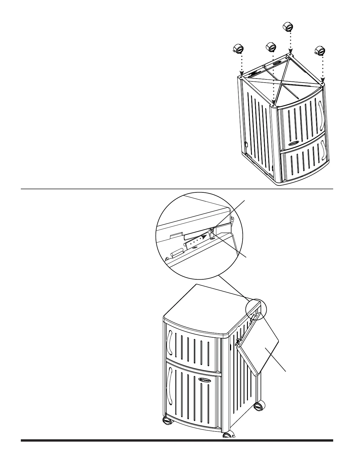 place Locking Casters at opposite corners of unit. Push one Caster into one Caster Receptacle in