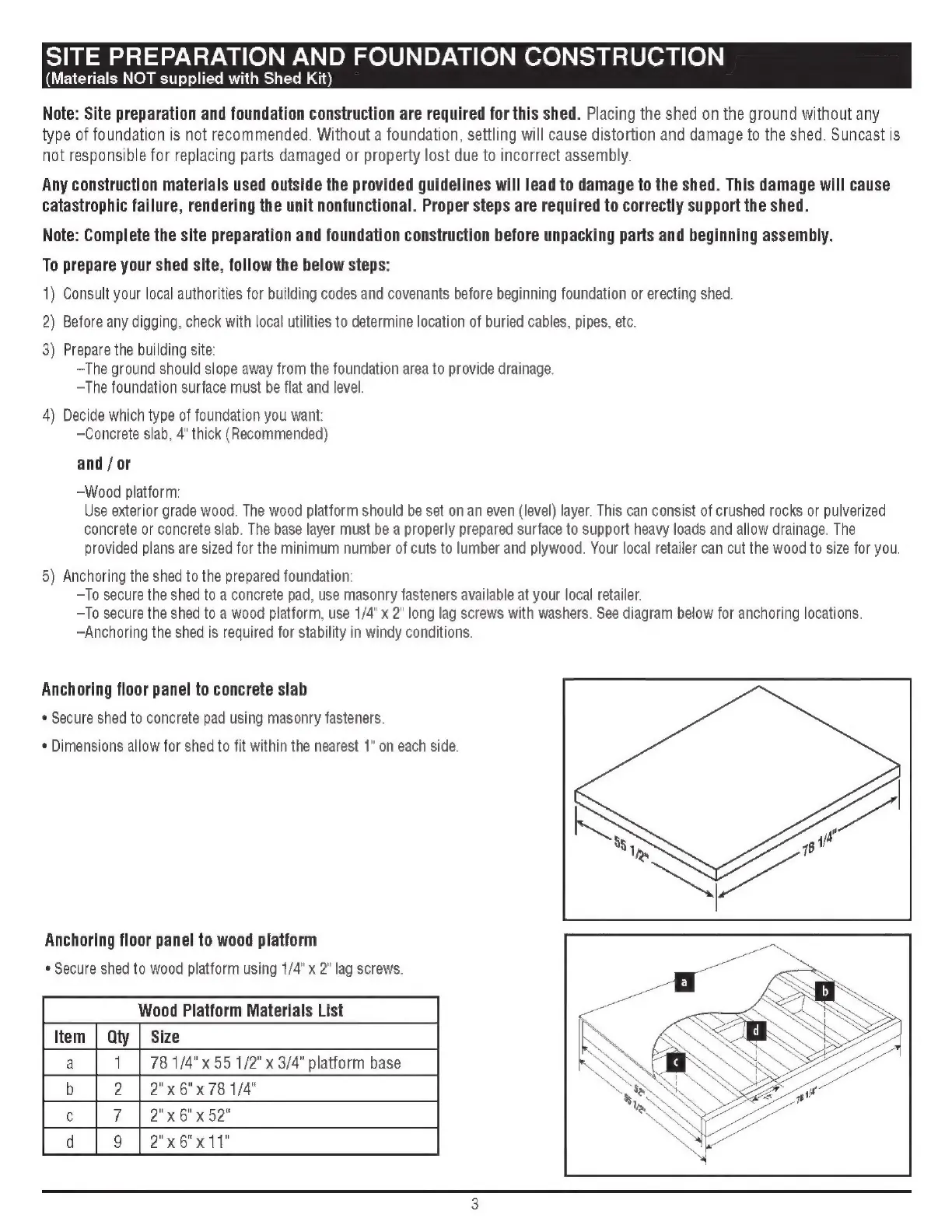 Suncast GLIDETOP BMS4900 - SITE PREPARATION AND FOUNDATION CONSTRUCTION; Anchoring floor panel to concrete slab; Anchoring floor panel to wood platform