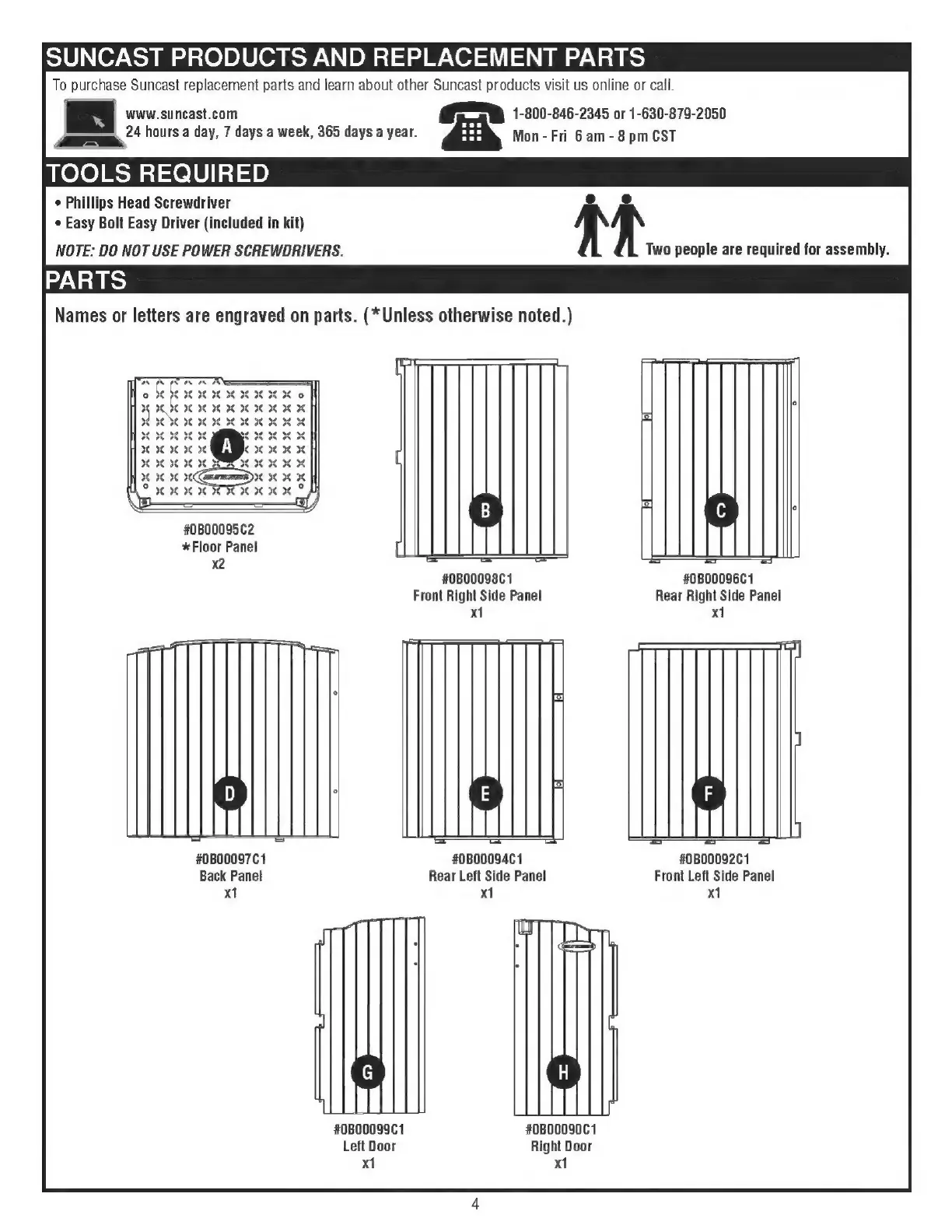 Suncast GLIDETOP BMS4900 - SUNCAST PRODUCTS AND REPLACEMENT PARTS; TOOLS REQUIRED; PARTS