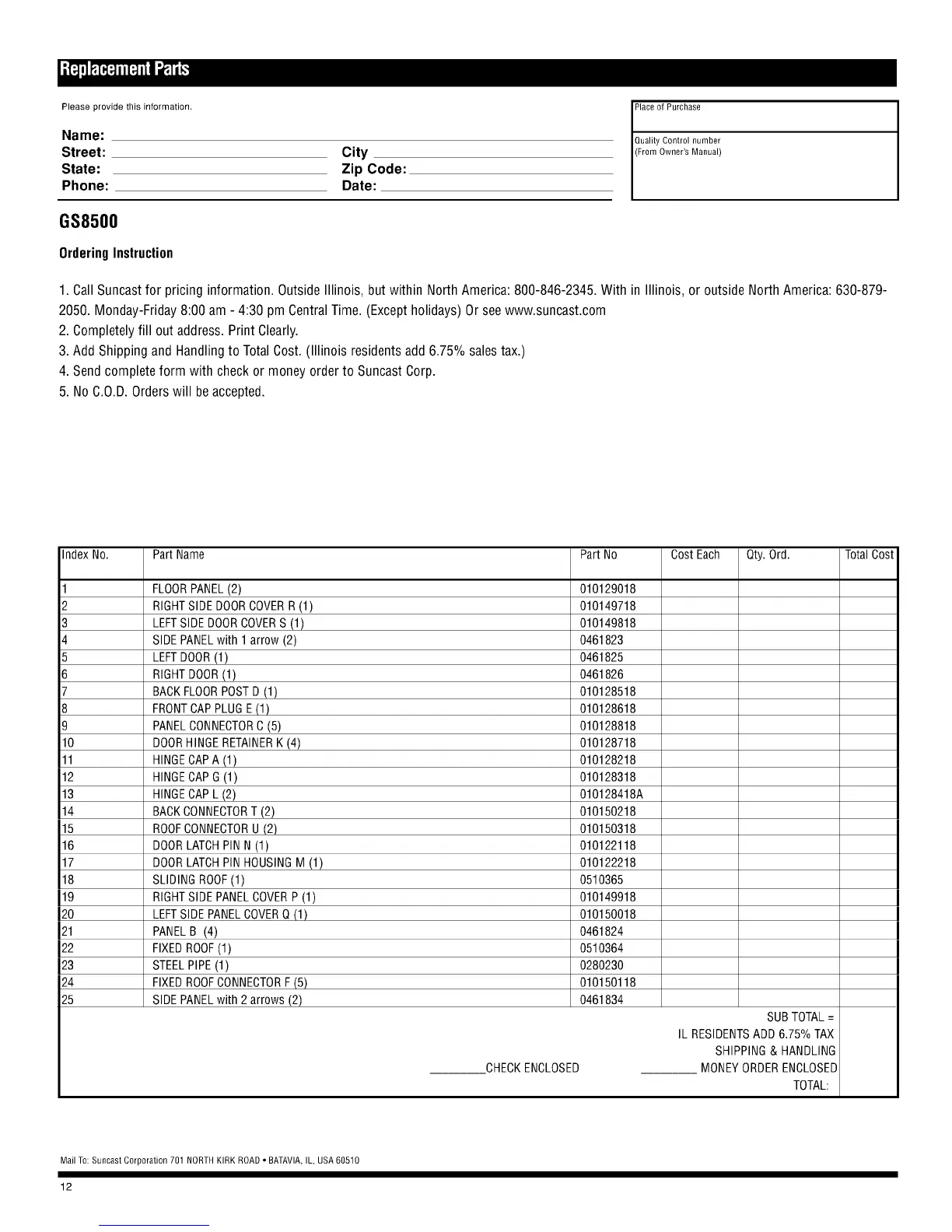 1. Call Suncast for pricing information. Outside Illinois, but within North America: 800-846-2345. With in Illinois, or outside North America: 630-879-