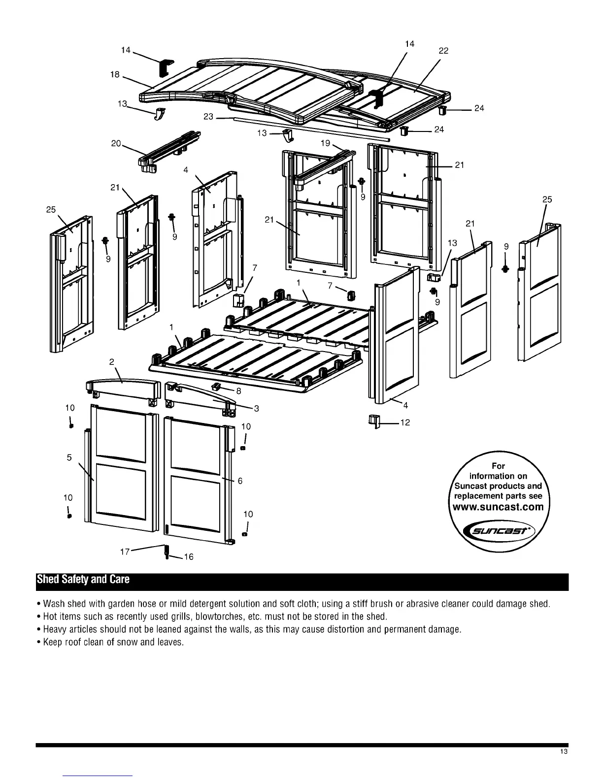 • Wash shed with garden hose or mild detergent solution and soft cloth; using a stiff brush or abrasive cleaner could damage shed.