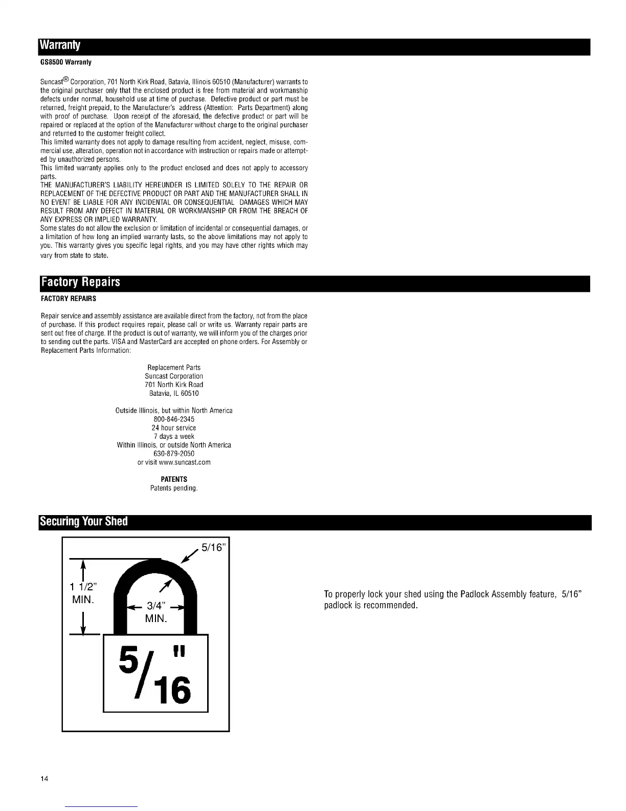 Suncast® Corporation, 701 North Kirk Road, Batavia, Illinois 60510 (Manutacturer) warrants to