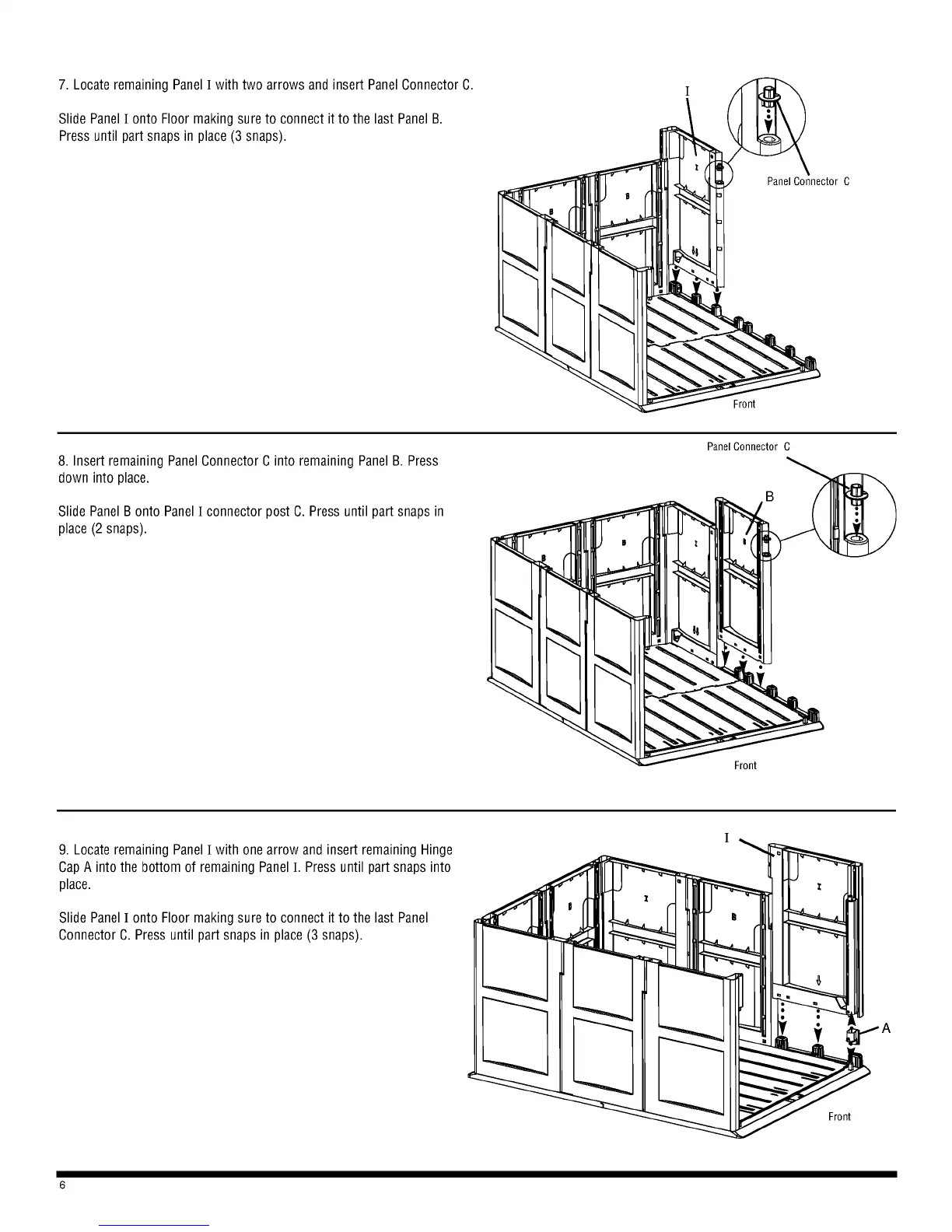 Slide Panel B onto Panel I connector post C. Press until part snaps in