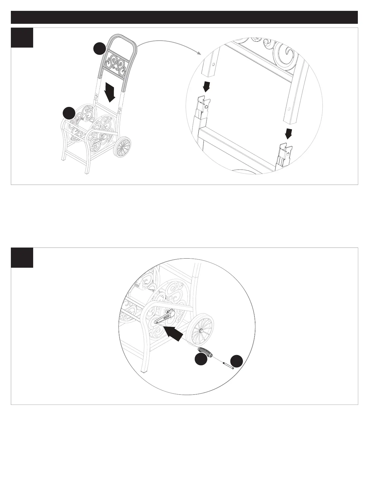 ES: Acople el mango (A) a la carcasa del carrete de manguera (B). Presione hacia abajo el mango (A) hasta que escuche un chasquido.