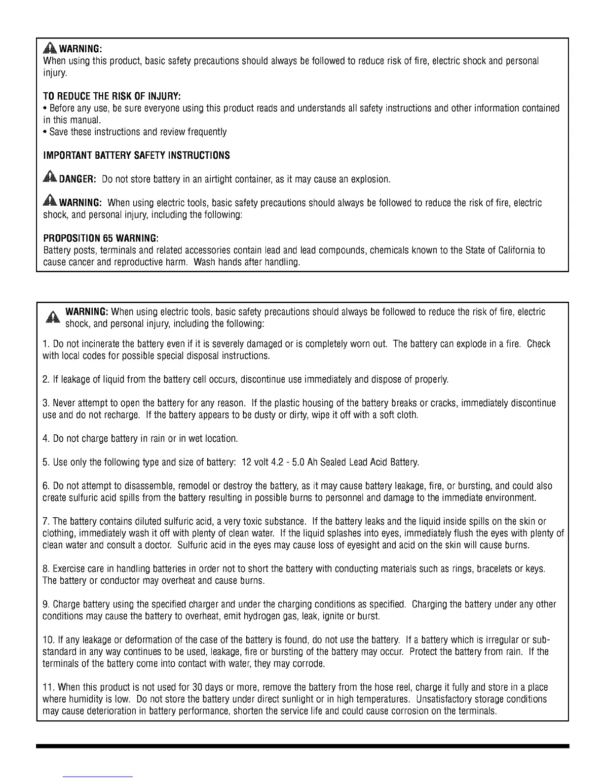 5. Use only the following type and size of battery: 12 volt 4.2 - 5.0 Ah Sealed Lead Acid Battery.