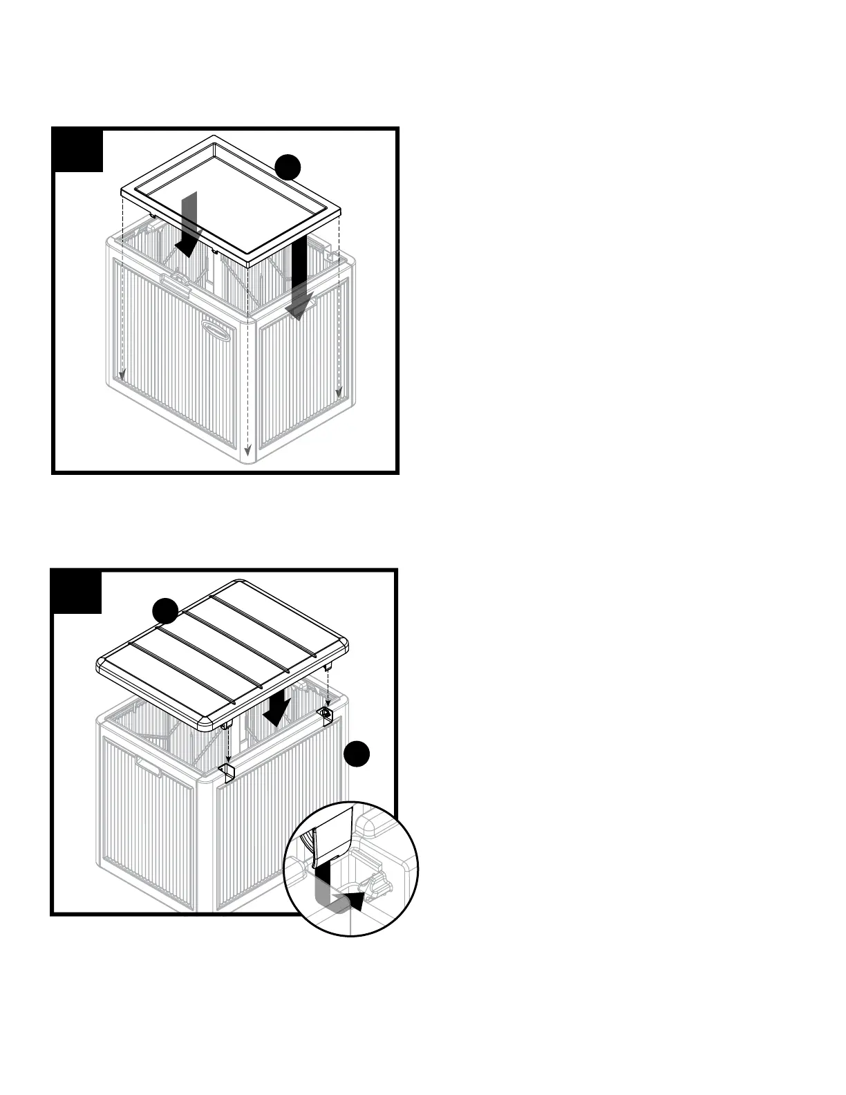 上部パネル(E)をボックスの上に設置します。上部パネル(E)のヒンジの