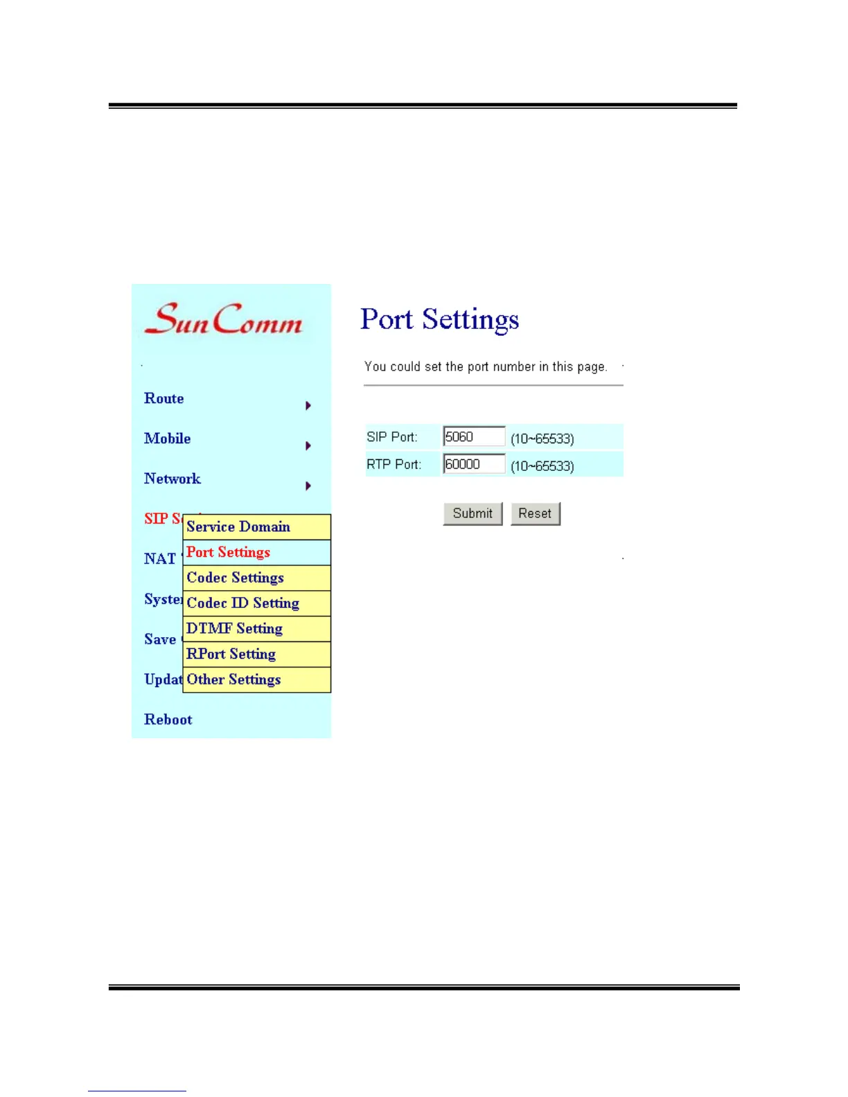 SunComm SC-375 - Port Settings; SIP and RTP Port Configuration