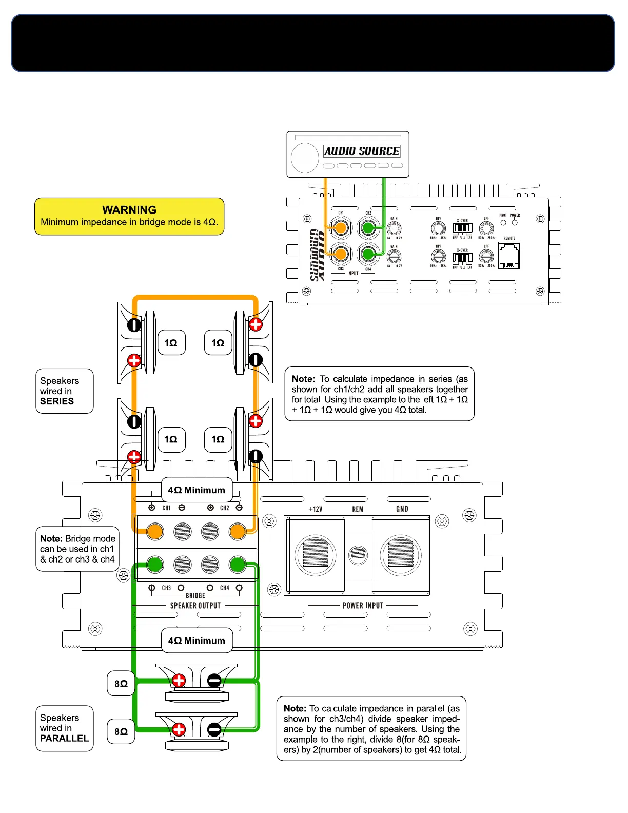 4 CHANNEL BRIDGE MODE FULL RANGE INPUT AND SPEAKER