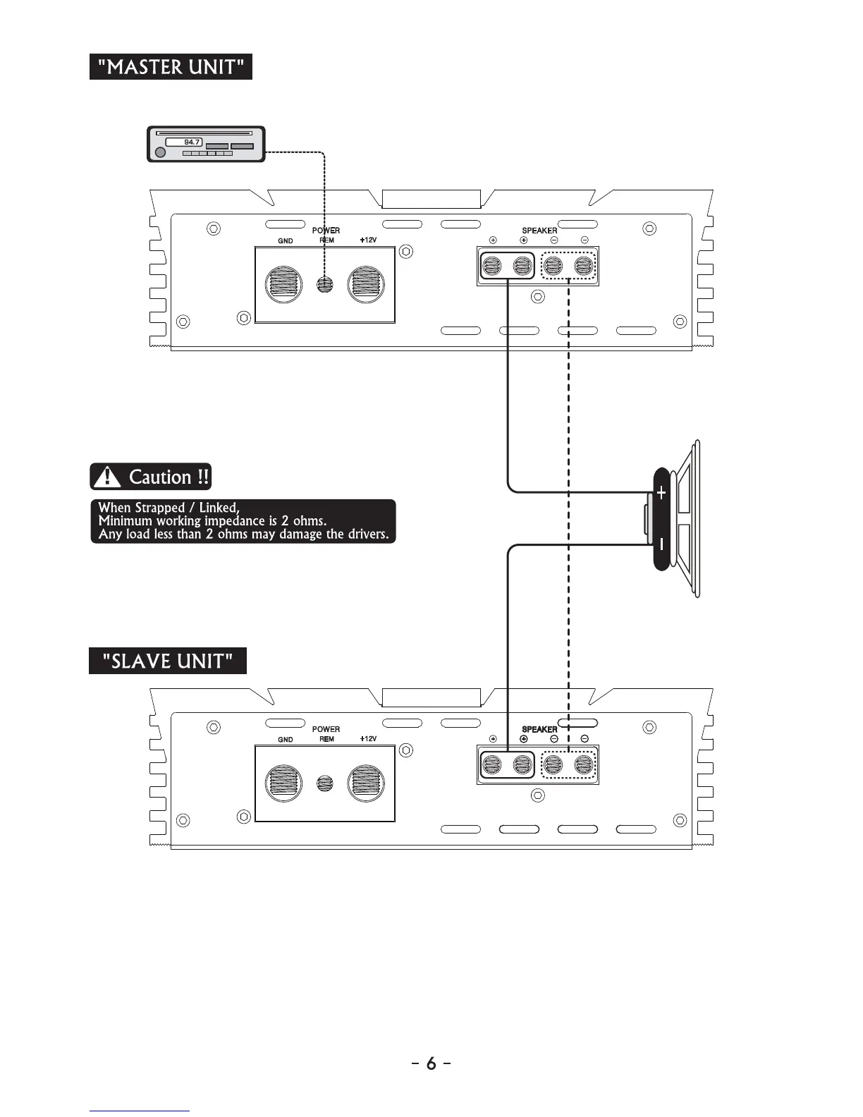 must be connected to the positive terminal of the MASTER amplifier and the negative terminal