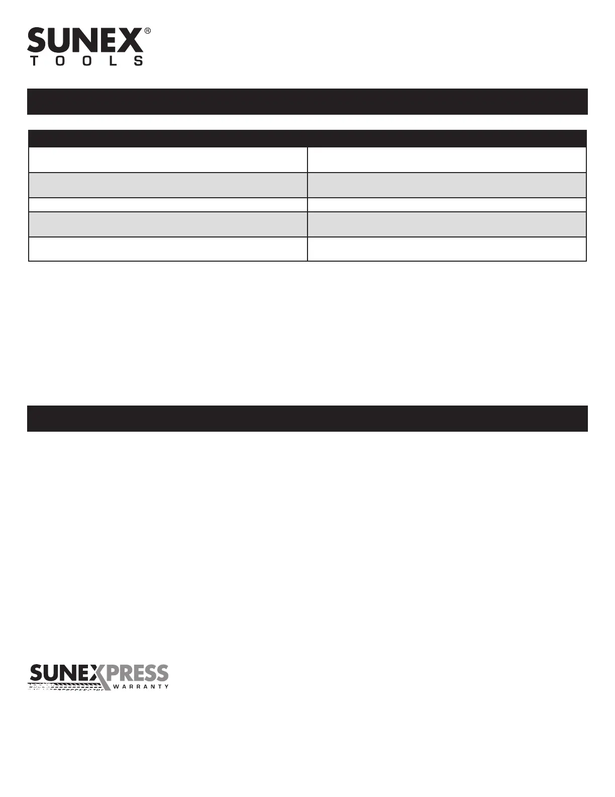 description de la défaillance présumée. Veuillez adresser par écrit toutes vos questions sur le service de garantie à Sunex Tools