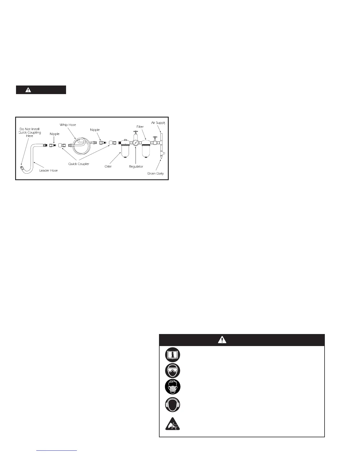 Linepressureshouldbeincreasedtocompensateforunusuallylongairhoses(over25feet).Minimumhosediametershouldbe3/8"I.D.Fittings