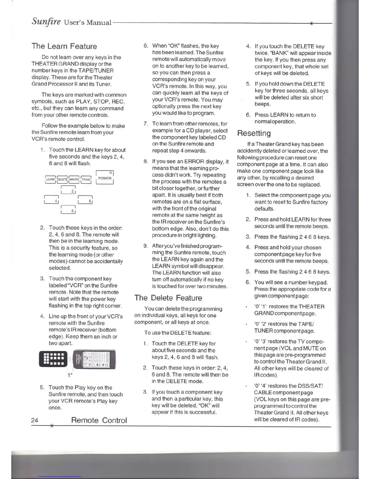 Sunfire THEATER GRAND PROCESSOR II - Programming the Remote Control; Learning New Remote Commands; Deleting and Resetting Commands