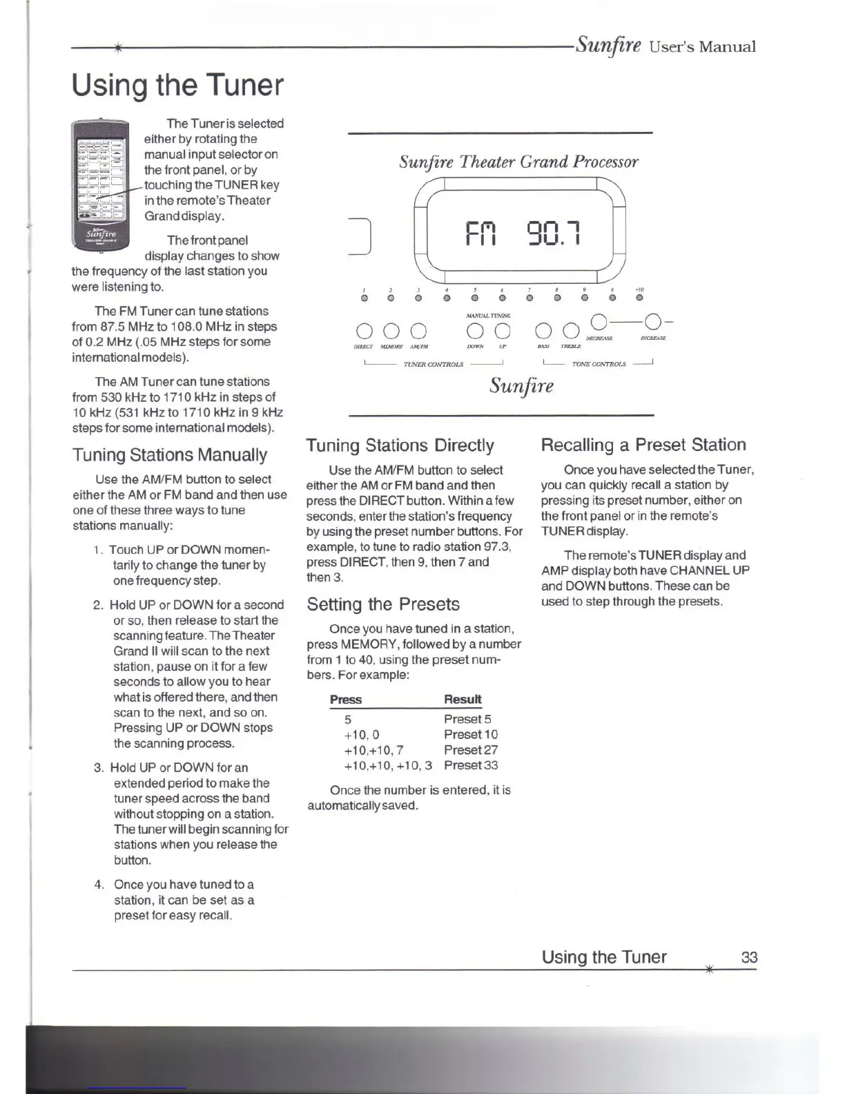 Sunfire THEATER GRAND PROCESSOR II - Using the Tuner; Tuning Stations Manually; Tuning Stations Directly; Recalling a Preset Station