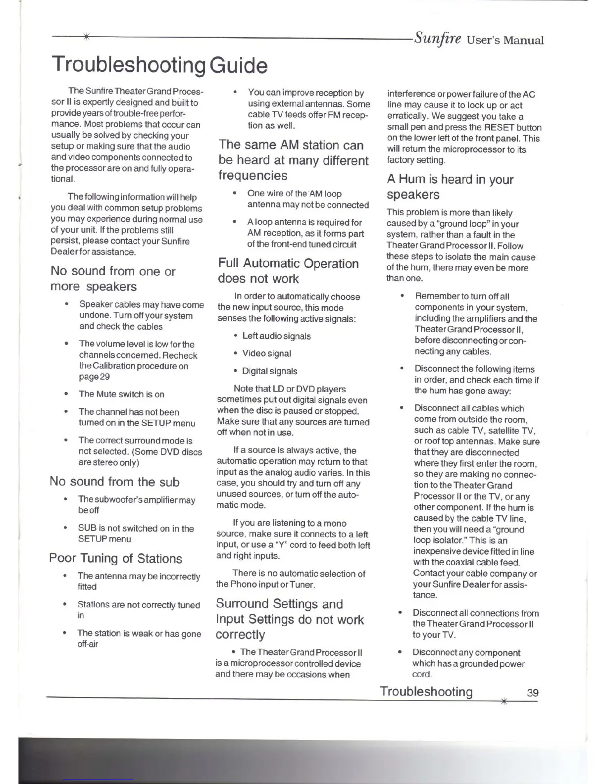Sunfire THEATER GRAND PROCESSOR II - Troubleshooting Audio and Operation Issues; Audio Output and Signal Problems; Surround and Input Setting Errors
