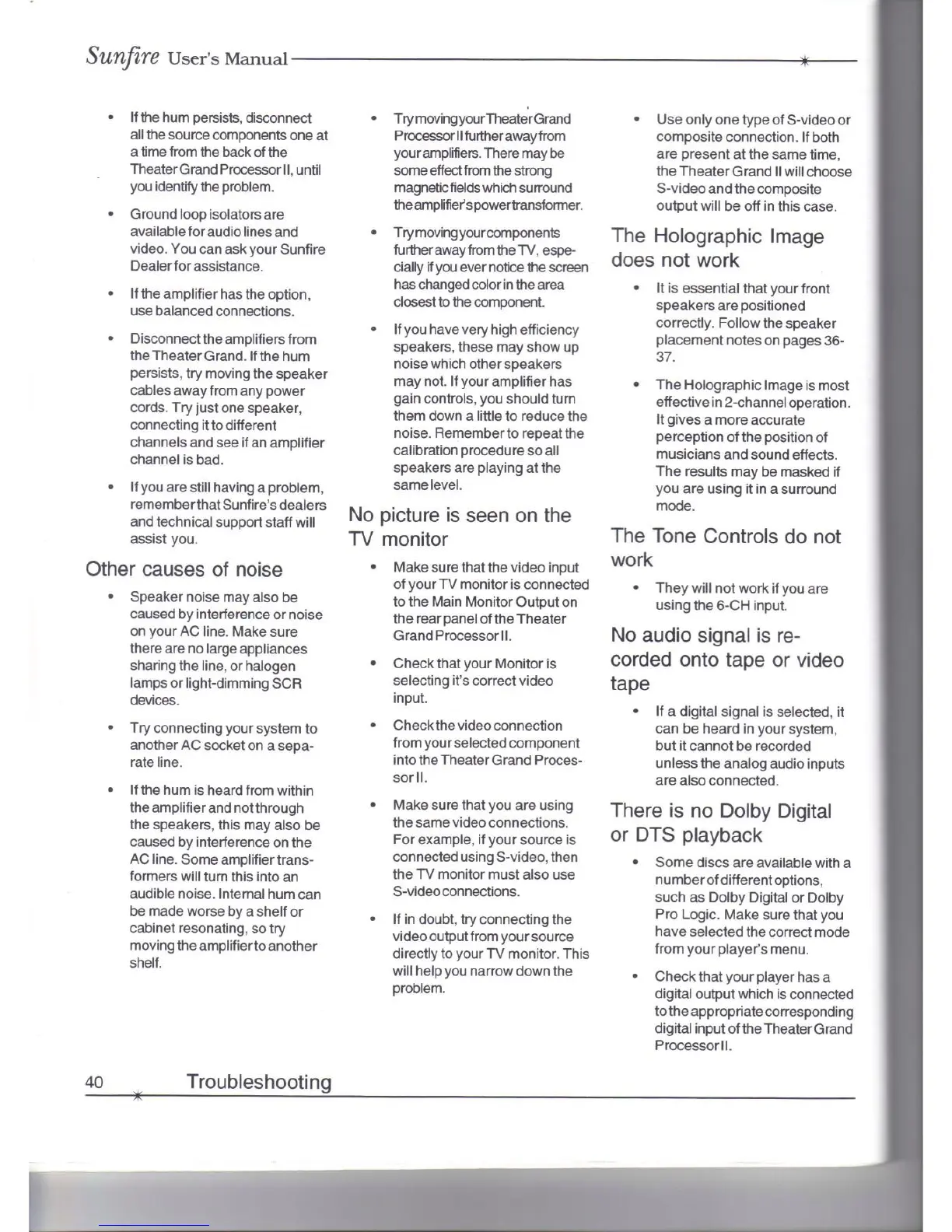 Sunfire THEATER GRAND PROCESSOR II - Troubleshooting Common Problems; Noise, Interference, and Video Issues; Recording and Playback Malfunctions