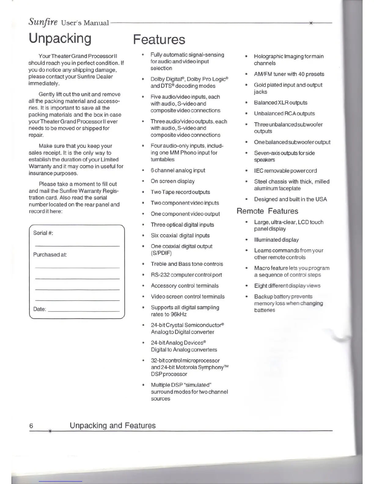 Sunfire THEATER GRAND PROCESSOR II - Unpacking and Product Features; Key Features and Connectivity