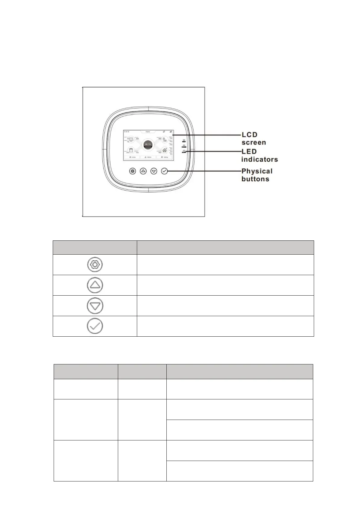 The operation and display panel below includes 1 LCD screen, 3 indicators, 4 touchable keys.