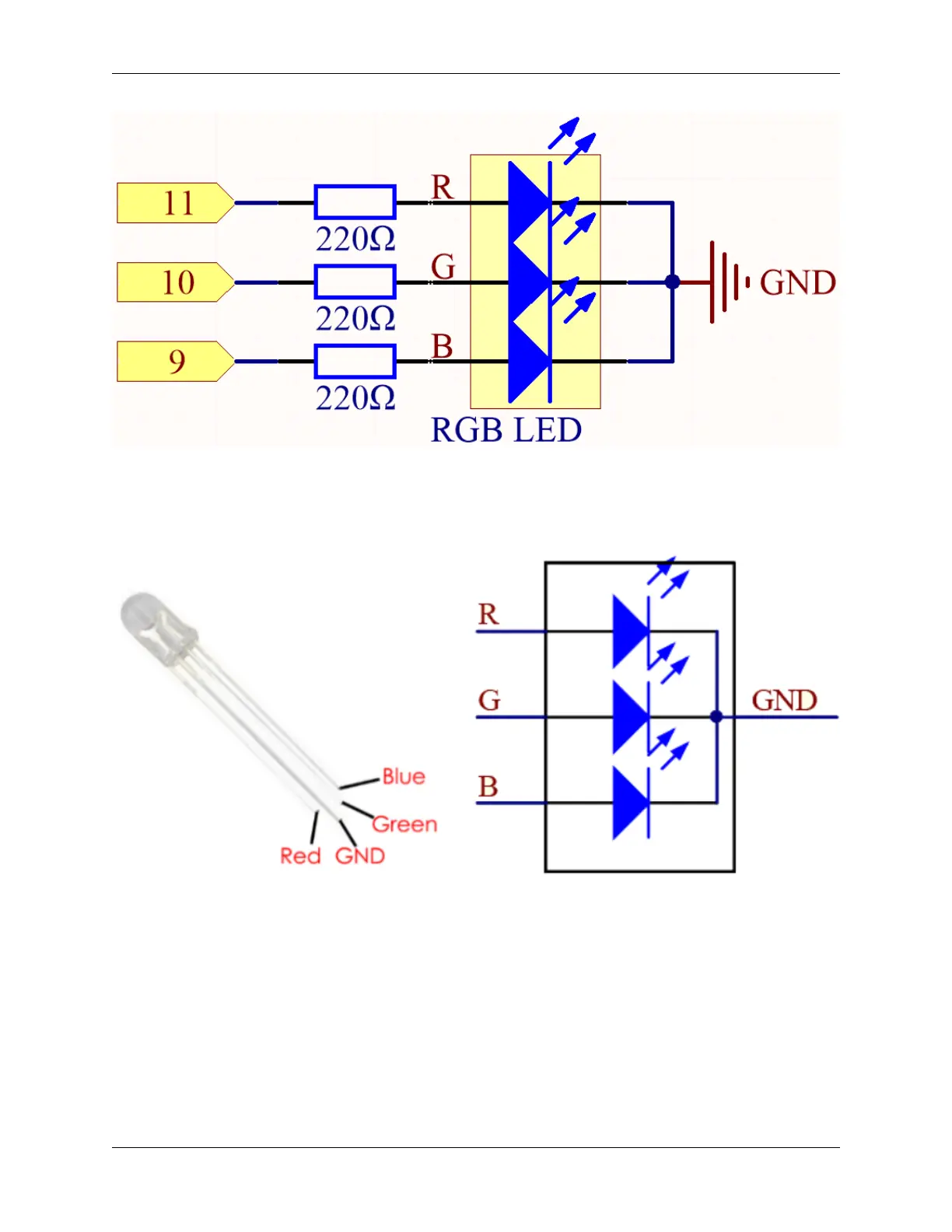 common cathode pin to GND. This allows the RGB LED to display a specific color by superimposing light on these