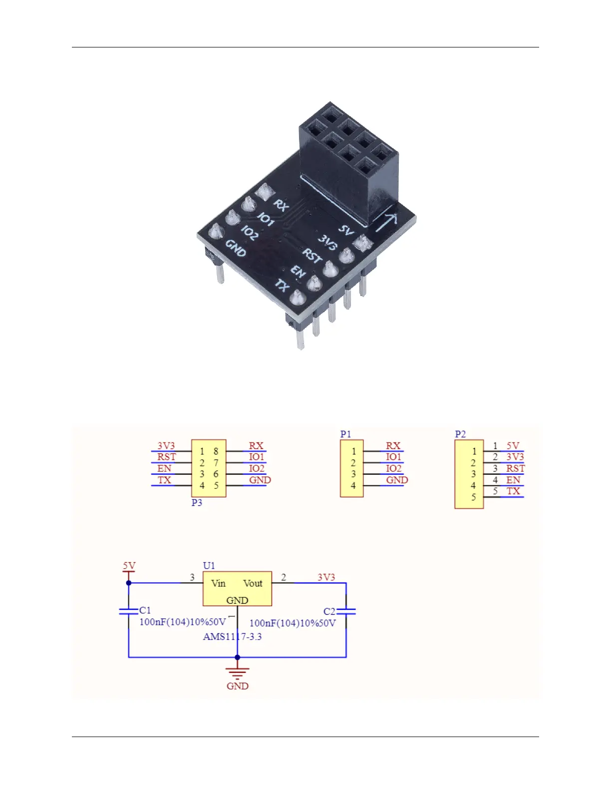 board. The integrated AMS1117 chip is used to drive the ESP8266 module after dropping the voltage to 3.3V.
