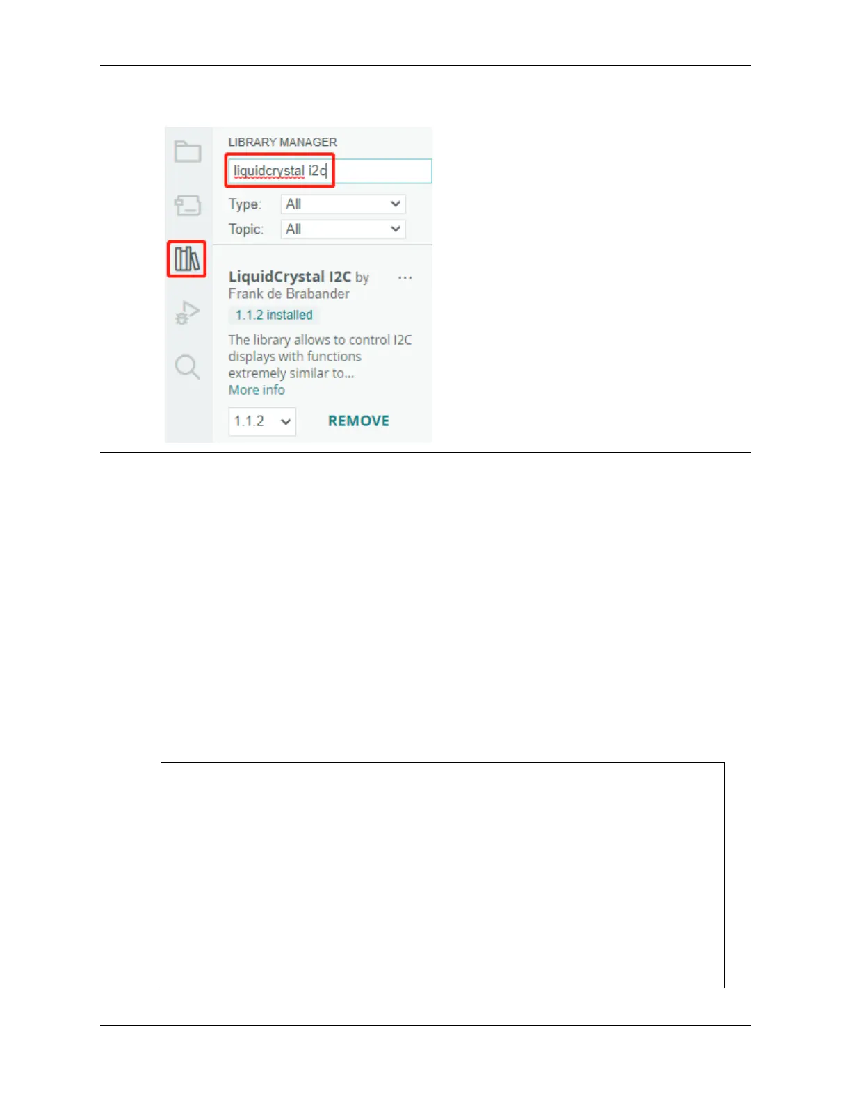 • The LiquidCrystal I2C library is used here, you can install it from the Library Manager.