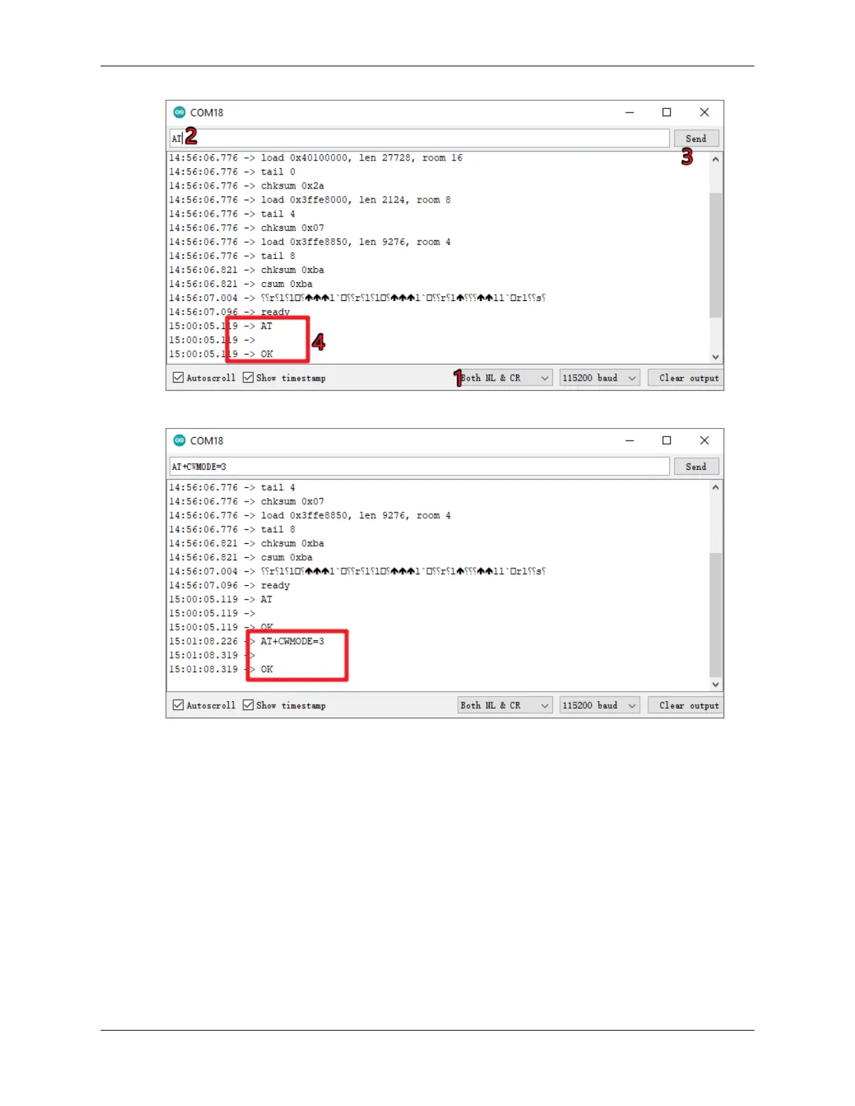 5. Enter AT+CWMODE=3 and the managed mode will be changed to Station and AP coexistence.