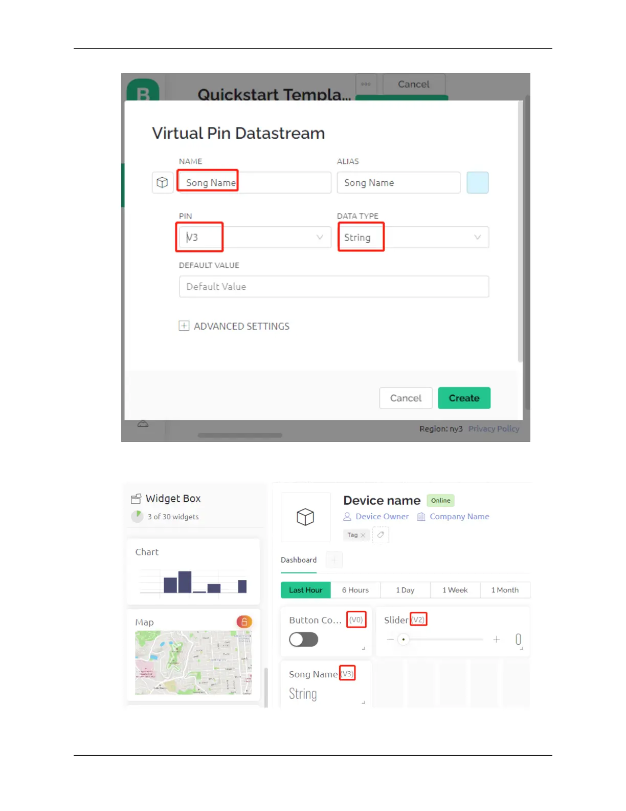 3. Go to the Wed Dashboard page, drag a Switch widget and set Datastream to V0 (V0 is already set in 2. Get