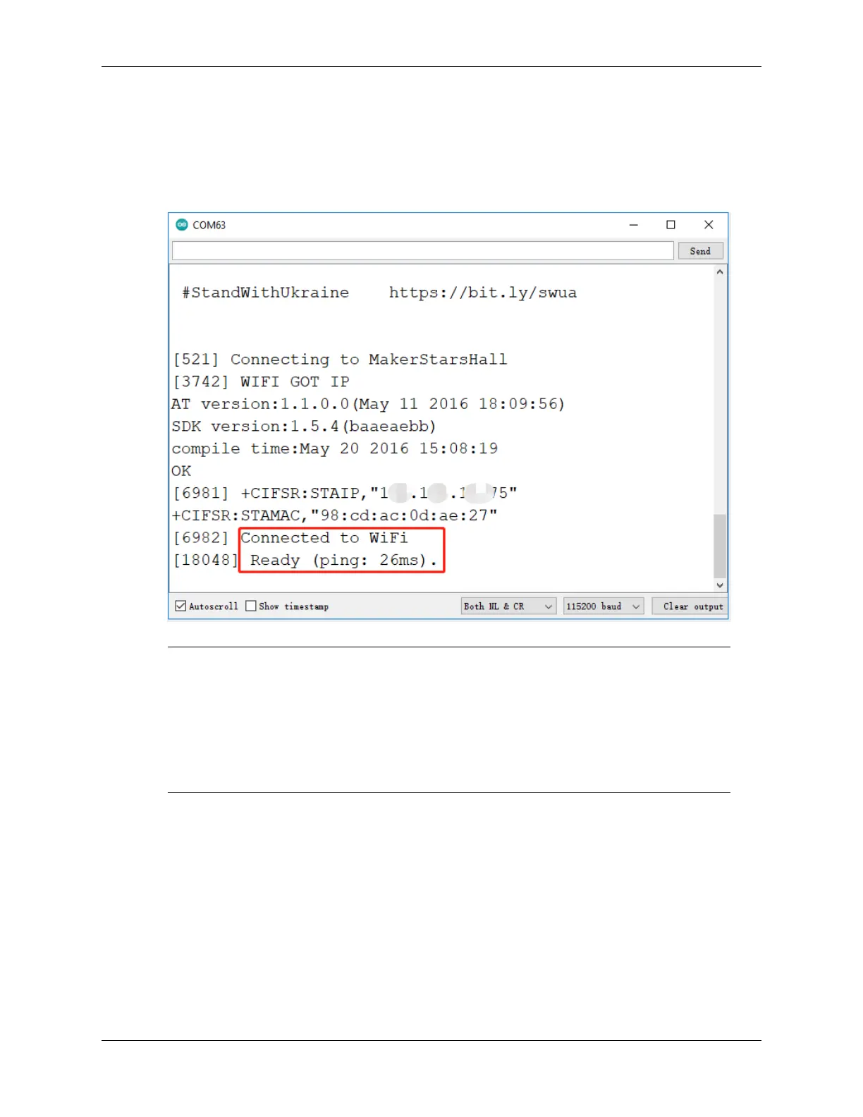 3. Open the Serial monitor(set baudrate to 115200) and wait for a prompt such as a successful connection to appear.