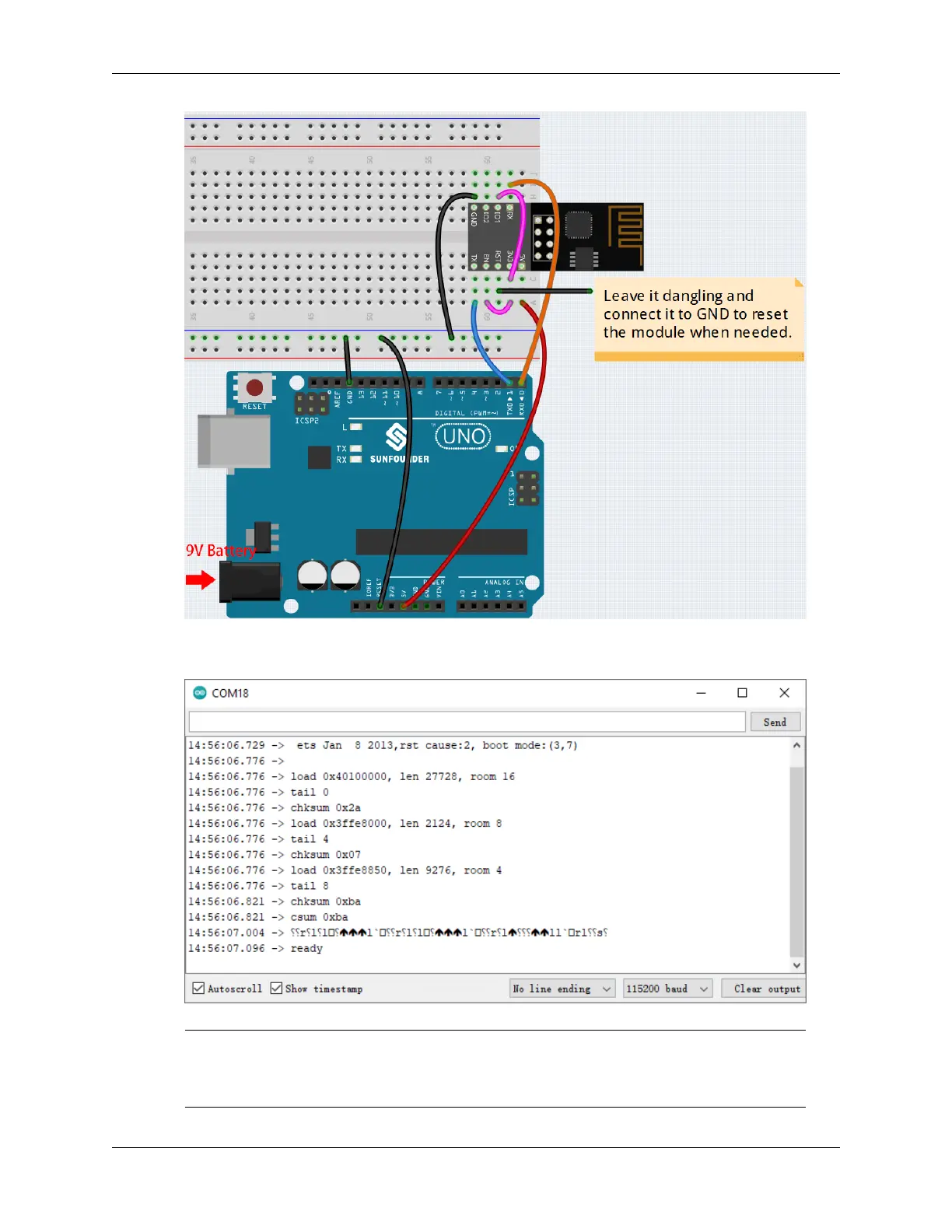 • If ready doesn’t appear, you can try to reset the ESP8266 module(connect RST to GND) and
