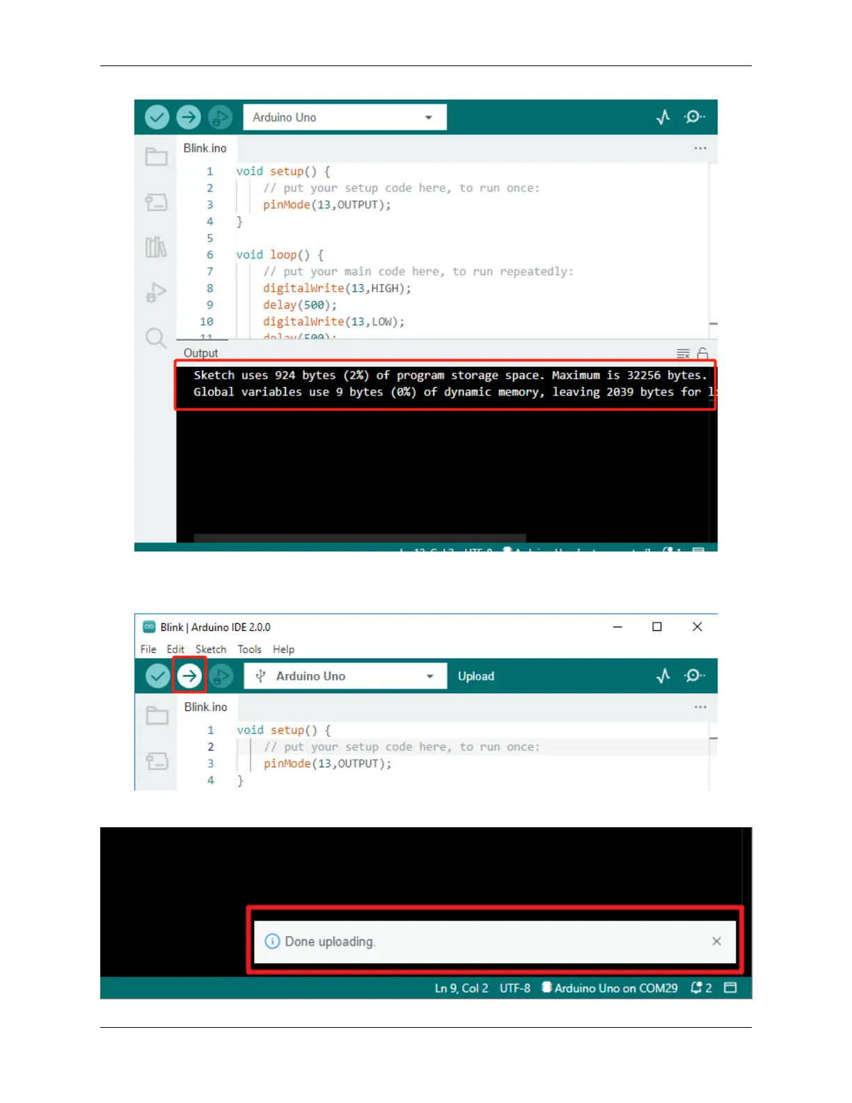 After completing the above steps, click the Upload button to upload this sketch to the board.