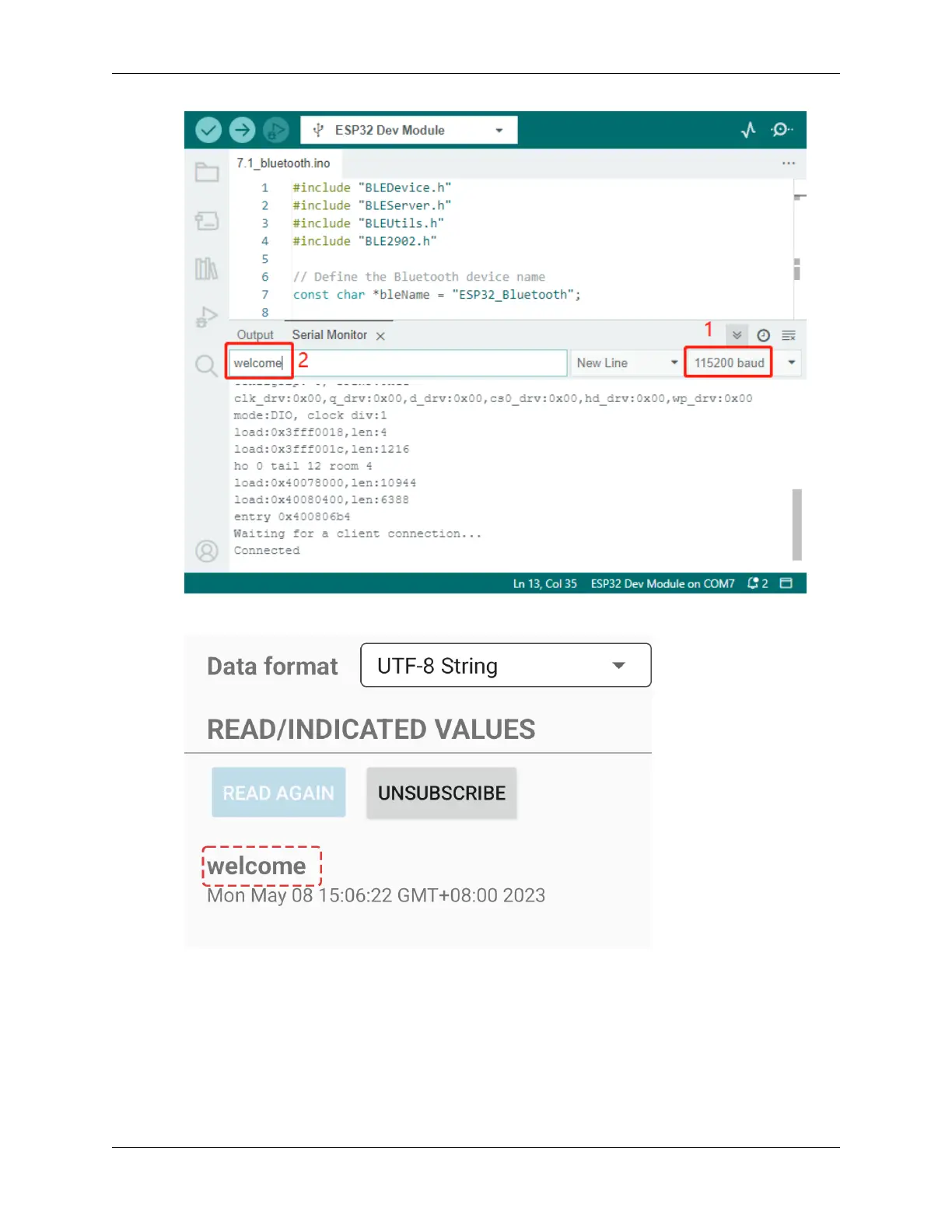 10. To send information from the mobile device to the Serial Monitor, click the Send UUID, set the data format to